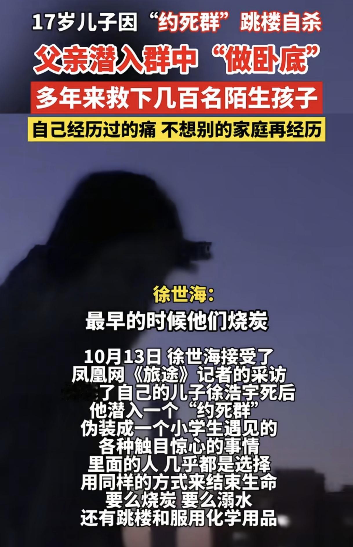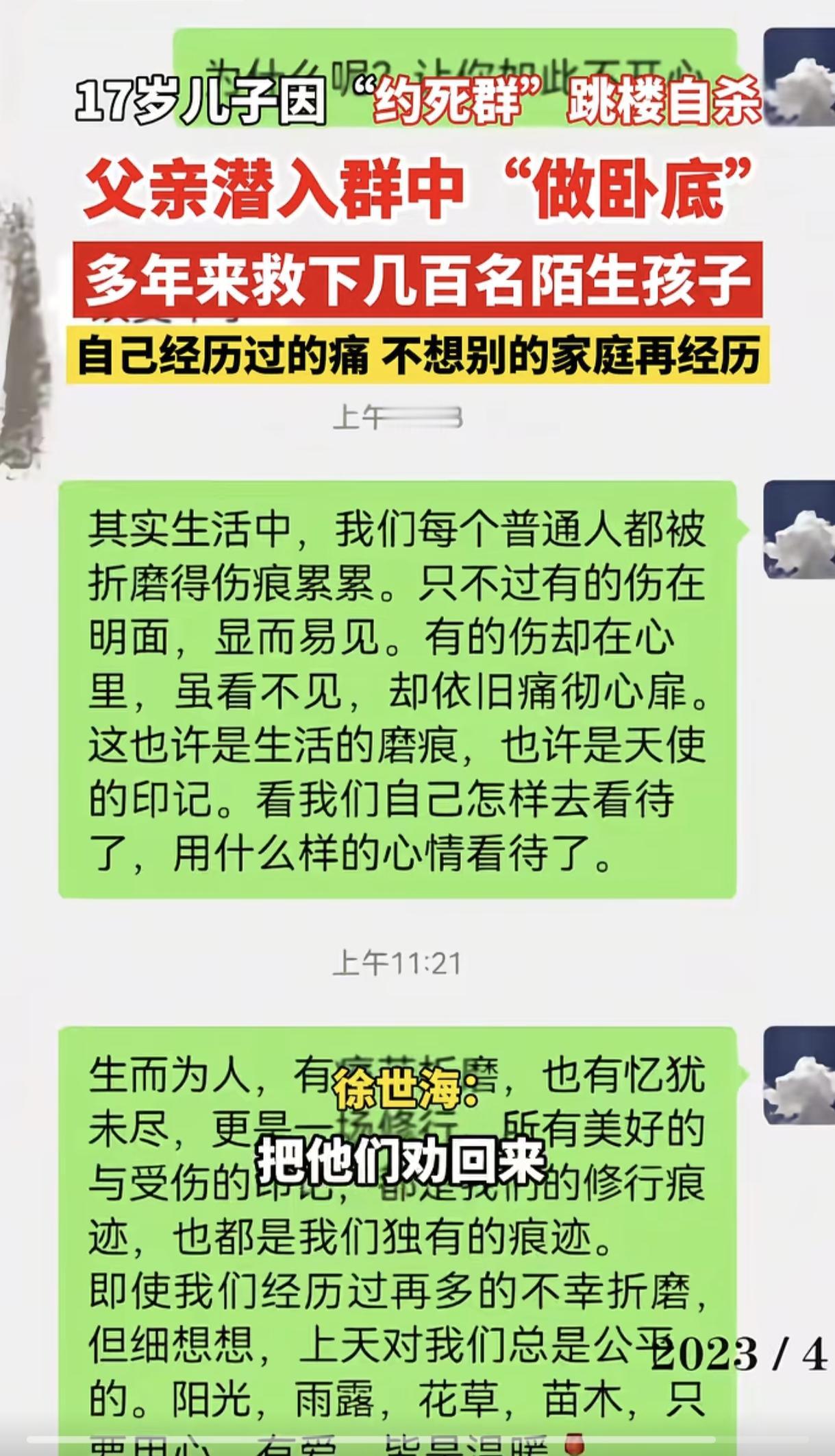 因“约死群”跳楼自杀的17岁男孩父亲徐世海,在儿子离世后,他没有沉浸在悲痛中无法自拔,而是化悲痛为力量,默默做了一件感动全网的大事!五年来,他潜潜伏在“约死群”挽救了数百名陌生孩子的生命,以这样一种特殊的方式纪念儿子,让儿子的悲剧不再重演! 2020年,17岁的徐浩宇是一位阳光帅气的大男孩,令人万万没想到,这样一位开朗外向的孩子竟选择在2020年5月12日这天跳楼结束了自己的生命。 在轻生当晚,徐浩宇细心地给弟弟洗了澡,洗了衣服,又温柔地将弟弟哄睡。很难想象,这么一位善良又暖心的大男孩,会如此决绝轻生。 父亲徐世海很不理解儿子的行为,他实在不明白儿子为何要这么做。为了寻求答案,他登上了儿子的QQ,竟赫然发现了一个触目惊心的“约死群”。 里面充斥着大量的负面情绪与轻生言论,几乎都选择用同样的方式来结束生命,要么烧炭,要么溺水,还有跳楼和服用化学用品。 而为了躲避网警的巡查,他们意思表达十分隐晦,如烧炭轻生的话,就不说烧炭,而说烧烤,如“晚上约烧烤的有没有?” 语言虽然平淡,却令人心惊肉跳! 每当看到这种情况,徐世海的心情都十分沉痛! 他决定冒充小学生在群里“卧底劝生”,几年下来,从引导到劝解,徐世海的“劝生”经验越来越丰富,成功劝回几百名陌生孩子,将他们从死亡的边缘拉了回来。 也有的孩子聊着聊着就没了,有的孩子家长千里迢迢跑过来找徐世海算账,而当徐世海拿出与孩子的聊天记录后,家长这才失声痛苦。 徐世海将救赎做到了极致,但结果怎样还得看孩子自己。 因为救赎的核心不是等待他人的救赎,而是自我主动寻找救赎的出口。 丧子之痛,是世间最沉重的悲恸之一。 它就像一把钝刀反复割裂父母的心,让很多父母往后余生都无法走出来。 然徐世海在遭受丧子之痛后,没有沉浸在悲痛中无法自拔,而是化悲痛为力量,潜入约死群挽救其他濒临绝望的生命。 他不仅挽救了那些陌生的孩子,也是在以一种特殊的方式纪念自己的儿子,让悲剧不再重演! 自己经历过的痛,不想别的家庭再经历! 这是一种大爱,也是父亲对儿子深沉的爱,更是对社会的高度责任感。 徐世海无疑是一位平凡又伟大的父亲,这个关于悲痛、救赎与大爱的故事,无法不令我们泪流满面。 社会各界一定要加强对网络环境的监管力度,多多关注青少年的心理健康,让悲剧永远不再重演。 生命何其珍贵,它是一场永远都无法重来的单程旅行,热爱生命,过好每一天,才不枉来世一遭。 (来源:阜阳新闻网)
