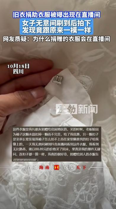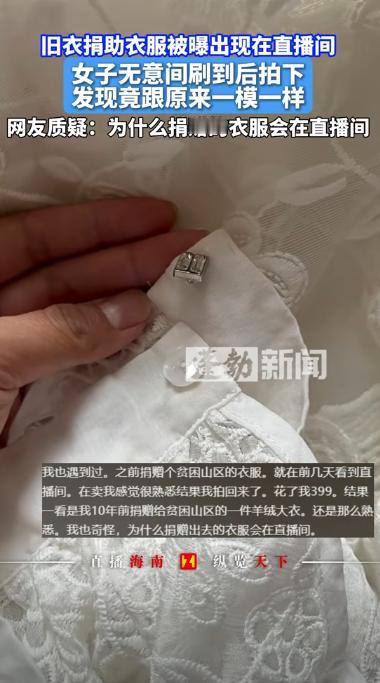 四川,女子在家看直播时,偶然刷到一件羊绒大衣,可她越看越眼熟,好像是自己十年前捐赠到贫困山区的那一件,为了避免误会,她花399元下单买了下来,而当她收到货,看到上面的扣子时,确定了就是当初自己的那一件! 一枚手工缝的水晶扣,过了十年,竟通过一场直播跟原主人意外遇上了。这时候它不再只是衣服袖子上的普通装饰,还能让大家看到,个人的好心在庞大的商业体系里,是怎样悄悄流转的。 事情的起因是,张女士在买这件衣服的时候,以为内饰最后一件了而且袖口少了一颗扣子于是就便宜卖给她了,张女士回家后,自己动手把这枚水晶扣缝了上去。 那些歪歪扭扭的针脚,还有她独有的打结方式,让原本有瑕疵的成品衣服,变成了带有她个人印记的私人物品。 然而在十年前的时候,张女士把这件大衣包装好放进了小区里写着 “旧衣捐山区” 的回收箱,这枚独一无二的扣子,也跟着有了新意义。 可大衣放进回收箱后,这枚扣子的身份悄悄变了,要知道,中国每年大概有 500 万吨回收旧衣,其中不到 5% 能真正送到贫困地区。 很多衣服都像这件大衣,进入了精密的商业链条,它们优惠的价钱被送往工厂,在工厂里,大衣的羊绒材质加上这颗水晶扣的品相,让它被归为 “高价值品”,注定不会被分解成工业原料,而是经过消毒、翻新后进入二手市场。 不料十年之后,张女士恰巧看到这枚水晶扣出现在了直播镜头里,甚至主播还称这件衣服就是因为那颗水晶所以被称之为“孤品”,为了打消她的顾虑于是就花了几百块钱将它买了回来。 拆开快递包裹,那些熟悉的、已经褪成浅灰色的缝线,还有衣服内衬上没变化的小破洞,再加上这颗水晶扣,一起成了没法反驳的证据。,一刻,张女士心里特别难受。 这时候的扣子,不再是单纯的商品,变成了能揭开旧衣捐赠背后真相的证据。 事后网友刷到了这件事情之后,一个网友在下面评论说,之前他们公司也要求捐赠不穿的衣物,结果没过多久他就发现自己毛衣被穿在了同事身上。 那么通过这件事情也告诉我们,我们真正需要的,是保证每一份爱心都能送到该去的地方,而不是让捐赠的衣服在某个直播间里,变成一件等着下一个买家的 “孤品”。 对此,你还有什么看法呢? (信息来源 :蓬勃新闻 )