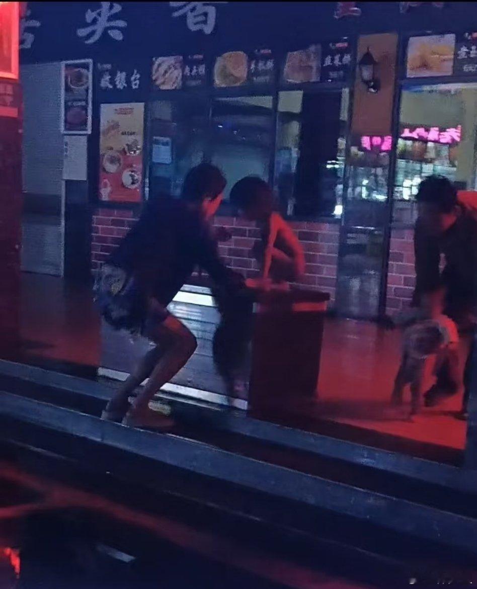 点了米线,他吃过后,把米线丢在桌上,小孩捡着吃。