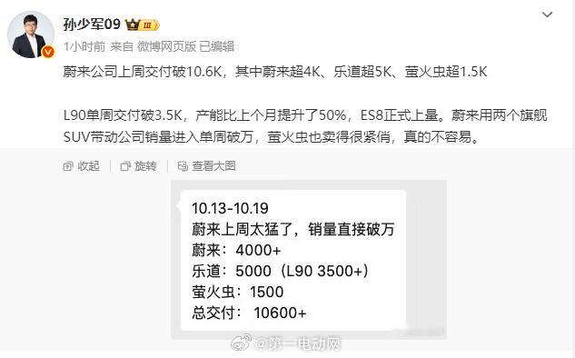 蔚来凭借两大热卖车型上周交付破万,没有想到萤火虫也卖的不错了