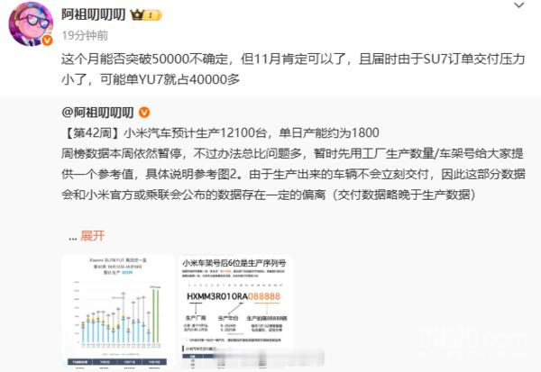 有车主预测小米11月交付能破5万,YU7占4万小米YU7新能源汽车
