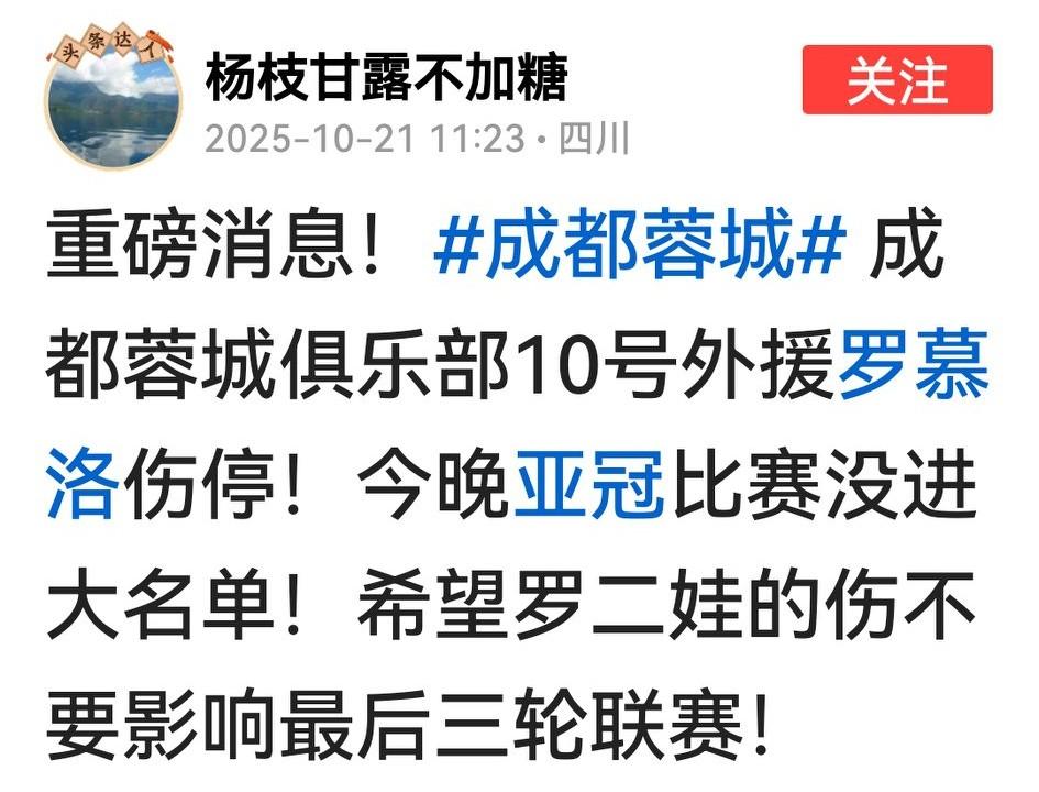 作为蓉城球迷,并不完全赞同苏东这个解说。主力连续受伤,拿什么去参与联赛冠军的争夺? 韦世豪尚未伤愈,上一场伤了罗慕洛,今天亚冠又伤了胡荷韬,在密集赛程中并不容易康复,联簧恐难追上与海港2分的差距。 有人老吐槽罗二娃,从今天比赛场面看,蓉城进攻离开老罗的串联和梳理什么也不是。如二娃和韦少不能尽快康复,联赛和亚冠恐双线失落。 接下来,成都蓉城还得进一步深入做出分析和选择,在中超夺冠很难的情况下,当老二老三结果差不多,而亚冠跨度较长,应该着力为亚冠进16强而拼搏。