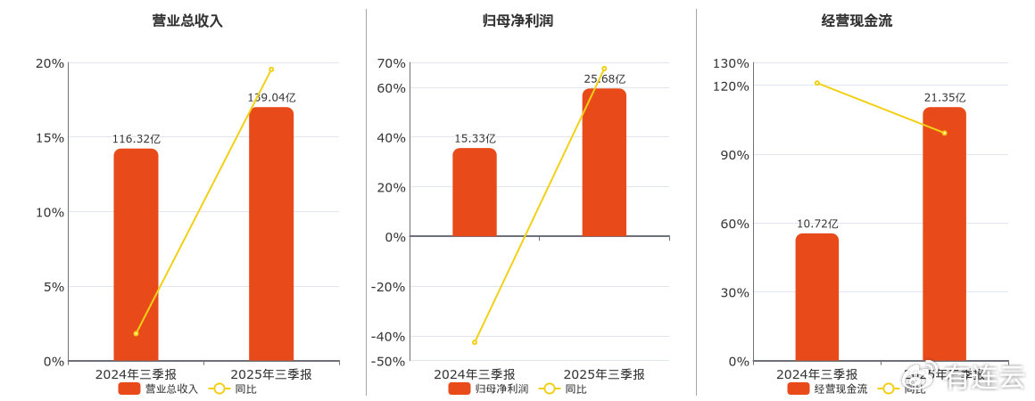 公司营业总收入为139.04亿元,较去年同报告期营业总收入增加22.72亿元,实现2年连续上涨,同比较去年同期上涨19.53%。归母净利润为25.68亿元,较去年同报告期归母净利润增加10.35亿元,同比较去年同期上涨67.51%。经营活动现金净流入为21.35亿元,较去年同报告期经营活动现金净流入增加10.63亿元,实现2年连续上涨,同比较去年同期上涨99.20%。