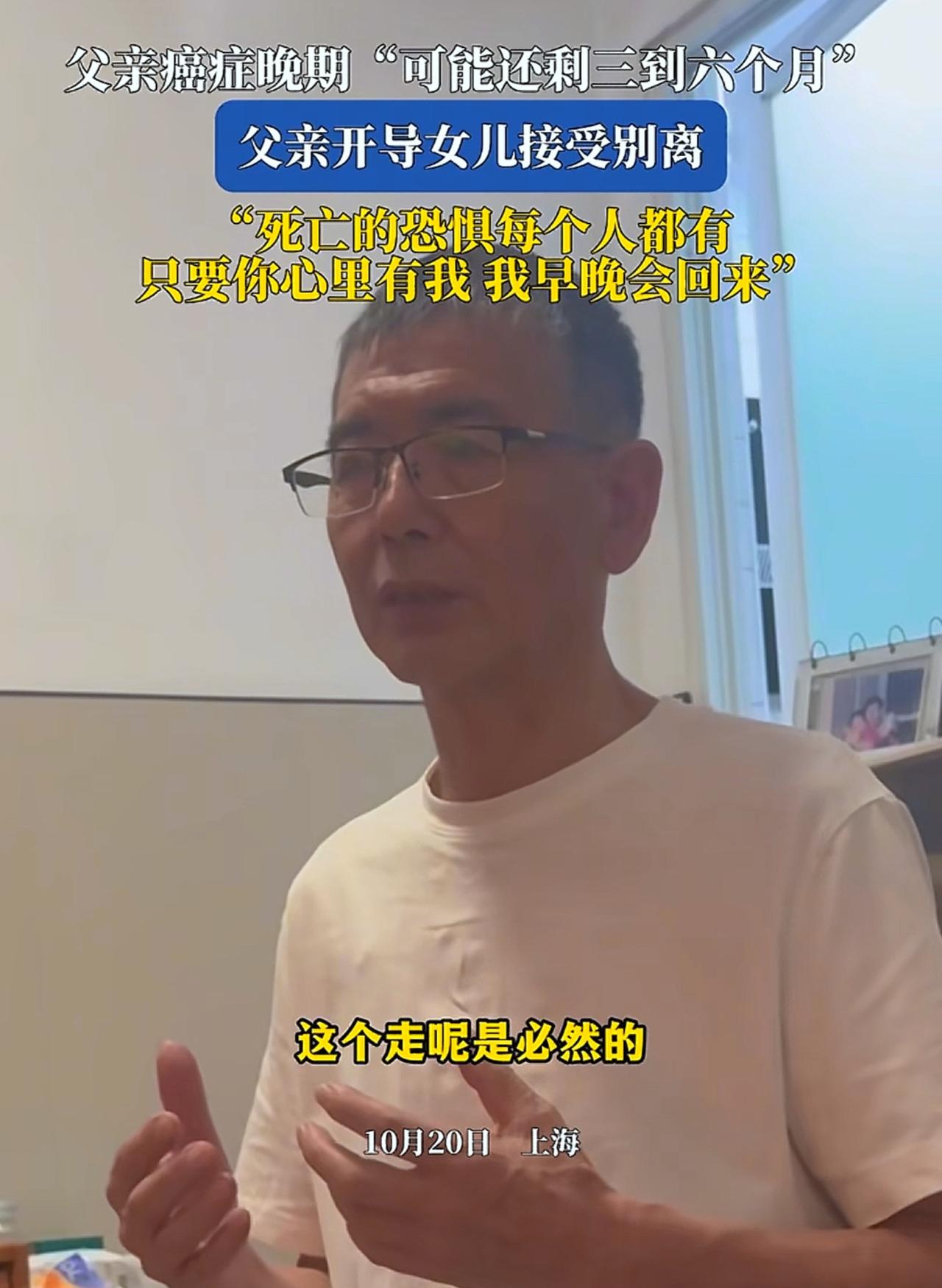 泪目了! 上海这位胰腺癌晚期爸爸的故事,鼻子一下子就酸了—— 哪有人面对死亡真的毫无波澜?他不过是把害怕嚼碎了咽进肚子里, 先一步帮女儿把“告别”这件事,拆成了一句句温柔的铺垫。 说“走后想我就抬头看”,哪是在安慰女儿,分明是自己在反复确认: 就算不在了,也能以另一种方式留在孩子身边。 他故意把生死聊得轻描淡写,其实是怕女儿某天突然被“失去”砸懵, 所以提前用爱搭了个缓冲垫。 很多人说“不怕死,怕见不到爱的人”,可这位爸爸更怕的是, 自己走后女儿没人护着那份脆弱。其实他不知道,他此刻这份冷静的温柔, 早就成了女儿心里最硬的铠甲——以后遇到难事儿,想起爸爸教她的“抬头看”, 就知道身后一直有光。 你们身边有没有过这样“嘴硬心软”的长辈?明明自己难过得要命, 却总想着先把你护得好好的,来评论区说说吧~