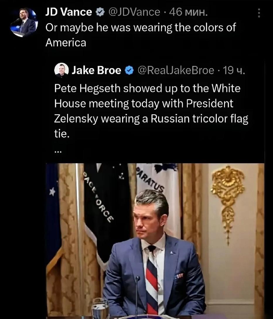 一条领带,差点把五角大楼送上热搜第一!——10月20日,美国防长赫格塞斯在布鲁塞尔见泽连斯基,领带白蓝红条纹,被眼尖网友指认“俄罗斯国旗配色”。 更炸的是,副总统万斯冲出来“救火”:“那是咱星条旗的红白蓝!”一句话,直接把TieGate 话题干到全球趋势榜。 原来,赫格塞斯根本不想聊穿着——他此行只为催欧洲追加对乌战机零件;结果镜头没拍预算,全拍领带。 原来,万斯“护旗”心切,却忘了自己9月刚放话“乌克兰得放弃入北约”——网友瞬间扒出旧账,说他才是真正“通俄”。 难怪评论区炸锅:“一个领带,把两巨头打成‘双料特工’,这剧情比《纸牌屋》还离谱!” 一条领带,扯下的不是颜色,而是“草台班子”的遮羞布—— 当防长像带货主播被挑衣服,当副总统像小红书客服在线怼网友,美利坚最锋利的两把外交刀,自己先互砍流量。 更荒诞的是,欧洲官员私下吐槽:“我们等的是F-16零件清单,结果等来一场配色P图大赛。” 所以,下次国际会议要不要干脆给政要们发“安全配色卡”? 你觉得赫格塞斯以后还敢系这条领带吗?会不会早已剪碎?