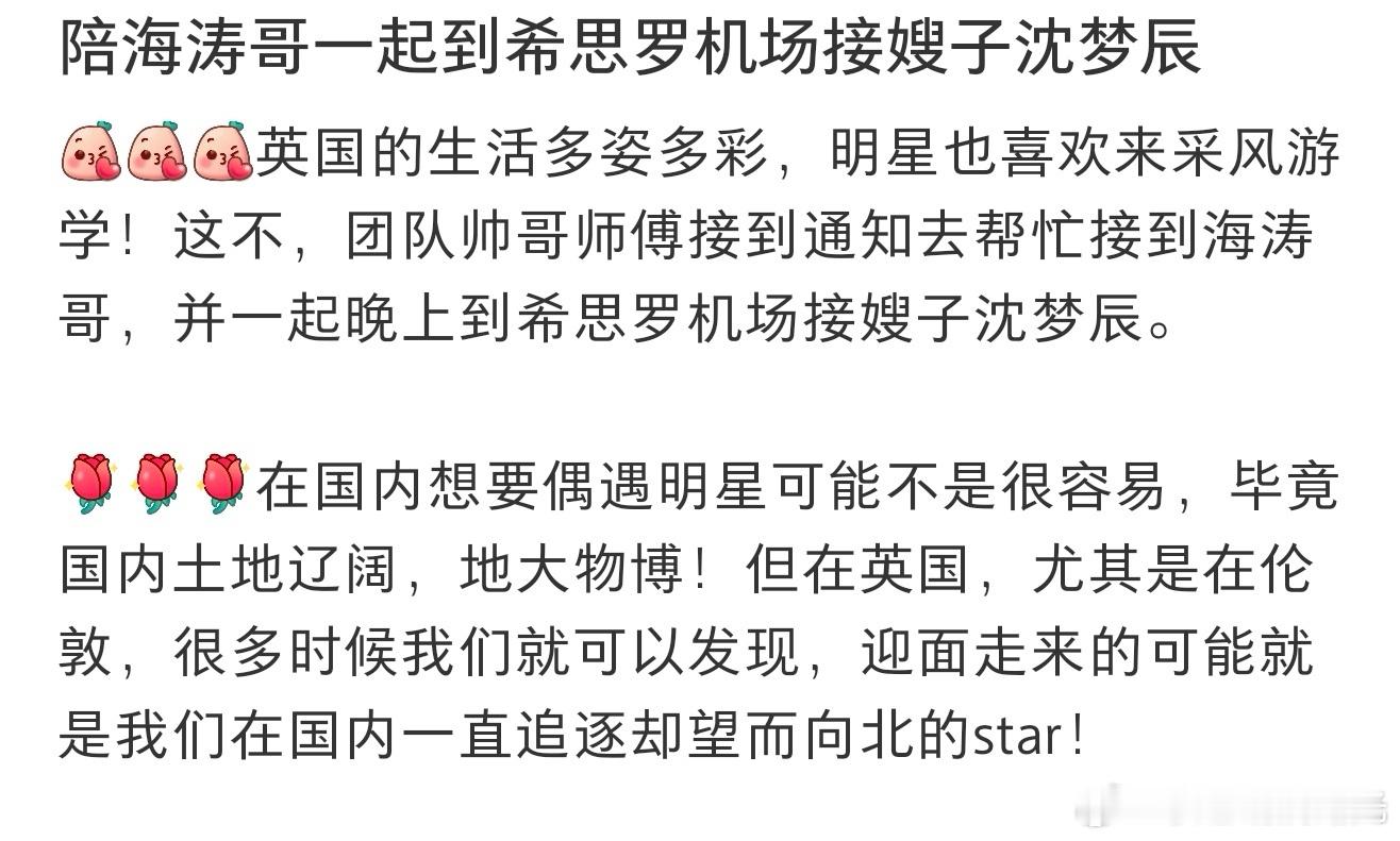 有网友发文,他们陪杜海涛到希思罗机场接沈梦辰。杜海涛和沈梦辰感情真的好,走哪都一块,感觉偶遇他俩一起出现的网友能饶地球两周半!一直幸福下去吧![鲜花]