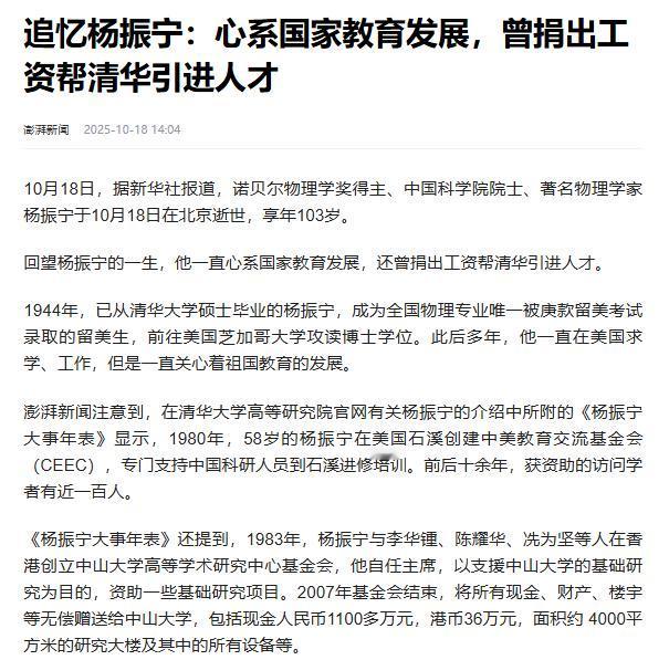 杨振宁将清华薪资,诺贝尔奖金捐献出来,看到金额,才知道多伟大 杨振宁7岁就住进清华园,父亲杨武之当时就在清华任教,科学馆的书香早就刻进了他心里,后来他拿着庚子赔款的资助留美深造,35岁拿下诺贝尔物理学奖,成了享誉世界的科学家,但心里始终装着故土。 1957年那笔诺奖奖金在当时可不是小数目,换算成人民币得几十万,要知道那会儿国内普通工人一年工资才几百块,可他转手就切出一大块捐给了清华基金,帮着刚经历动荡的母校重建科研根基。没人想到这只是个开始,往后几十年,他的钱袋子始终朝着祖国的方向敞开。 上世纪80年代他还在美国当教授,年薪早超过30万美元,折合人民币两百多万,这在国内教授月薪才几十块的年代,说是“天价收入”都不为过。 但他没把钱花在洋房名车上,反而在纽约捣鼓出“与中国学术交流委员会”,自己贴钱跑遍香港和美国找资助,发着高烧都要开车见捐赠人,就怕错过给中国学者争取机会的可能。 前后十余年,经他手资助的学者远不止80个,实际超过1200人,北大前校长陈佳洱、中科大前校长谷超豪这些后来撑起中国科研半壁江山的人物,当年都是靠着他的资助才摸到了国际前沿的门槛。 那会儿他常说,钱花在培养人身上比什么都值,这话可不是空架子,光是给学者们垫付的路费和生活费,累积起来就不是个小数目。 2003年81岁的他搬回清华园,把住所起名“归根居”,清华给的100万年薪在当时高校里是顶格待遇,比很多大学校长的收入都高,可签合同当天他就跟校长顾秉林说“我不是来挣钱的”。这笔钱每到账就直接转进清华高等研究院的账户,一捐就是十几年,算下来上千万人民币没进自己腰包。 更让人佩服的是,他把美国纽约的大房子卖了,凑出100万美元捐给研究院当启动资金,要知道那房子在当时能换好几套北京的豪宅,他却眼都不眨地换成了科研经费。 有人酸溜溜说他回国图名,可看看他的日子,住的是学校公寓,日常开销靠积蓄和偶尔的讲课费,哪有半分“图利”的样子。 这些钱花得比谁都精明。他用年薪设立“振宁物理奖学金”,每年挑十几个有潜力的本科生,奖金从一万到五万不等,还亲自翻学生的学习报告,逐条写意见。十多年下来上百位学生受益,不少人后来成了物理领域的骨干。 更关键的是他用这笔钱当“敲门砖”,2004年硬是把图灵奖得主姚期智从普林斯顿请回清华,填补了中国理论计算机领域的空白。姚期智后来创办的“姚班”,成了全球AI界的“黄埔军校”,旷视科技的创始人印奇、小马智行的掌舵人楼天城,全是从这儿走出来的。 施一公都说,杨先生这钱花得值,靠着他的声望和经费,一批原本不可能回国的大师级科学家都来了清华。 他的捐献从来不止是钱。2021年清华建校110周年,他把办公室里2000多件图书、手稿、书信全捐了,从早年的演算稿到与爱因斯坦的通信,每一件都是无价之宝。汶川地震时,他又捐出50万给灾区建学校,别人问他怎么捐这么多,他只说“孩子比什么都重要”。 2018年他还联合马化腾发起“科学探索奖”,盯着奖金要花在青年学者最关键的那几年,说这是“给未来买保险”。 这些事凑在一起才明白,他捐的哪里是钱,是把自己的声望、资源甚至人生轨迹,都折成了中国科研的“铺路石”。 1957年他拿诺奖时,父亲杨武之说这能打掉中国人的自卑感,这话没说错。当年他捐诺奖奖金时,中国科研还在低谷;捐年薪时,国内顶尖人才还很稀缺;到后来捐手稿、引人才,一步步看着中国科技赶上来。 他自己说一生最重要的贡献是改变中国人“不如人”的心理,这些真金白银的捐献就是最实在的底气——一个拿过世界最高荣誉的科学家,愿意把最值钱的东西都砸给祖国的未来,这种赤诚比任何豪言壮语都有力量。 这哪里是“捐钱”,分明是用自己的人生给中国科技“输血”。