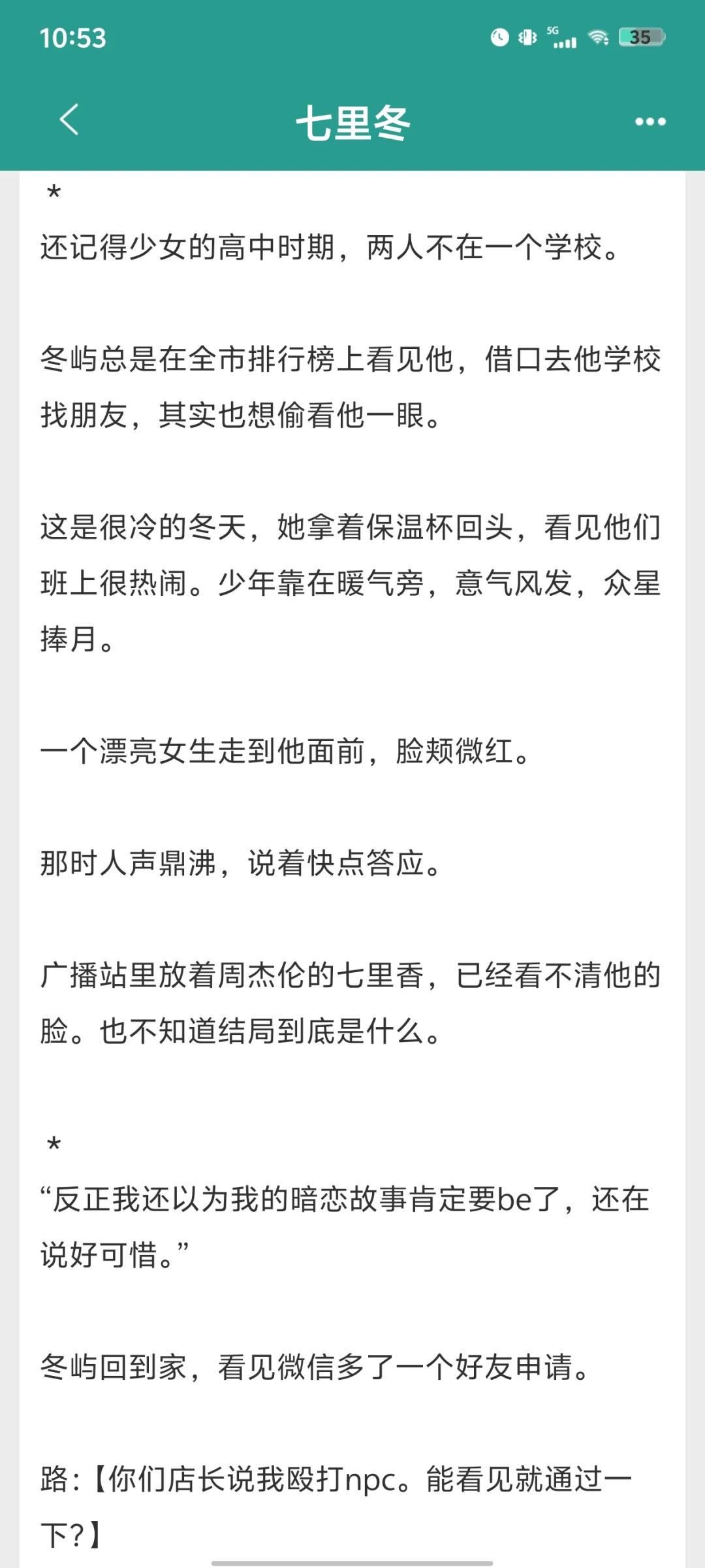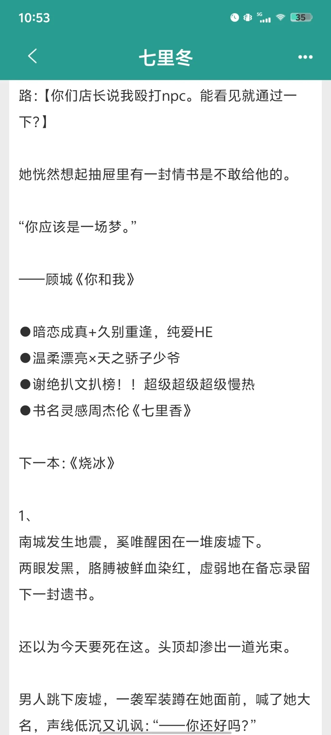 《七里冬》by小长矜 [种草R]刚完结的文,一共113章 暗恋成真,久别重逢 校园文!完结可入! [桃子R]女暗恋男,男主天之骄子,高中时期女主暗恋男主,男主压根没注意到女主,高考后在一起也没给女主安全感,被女主甩了才懂珍惜,女主的暗恋成真特别酸涩好哭。