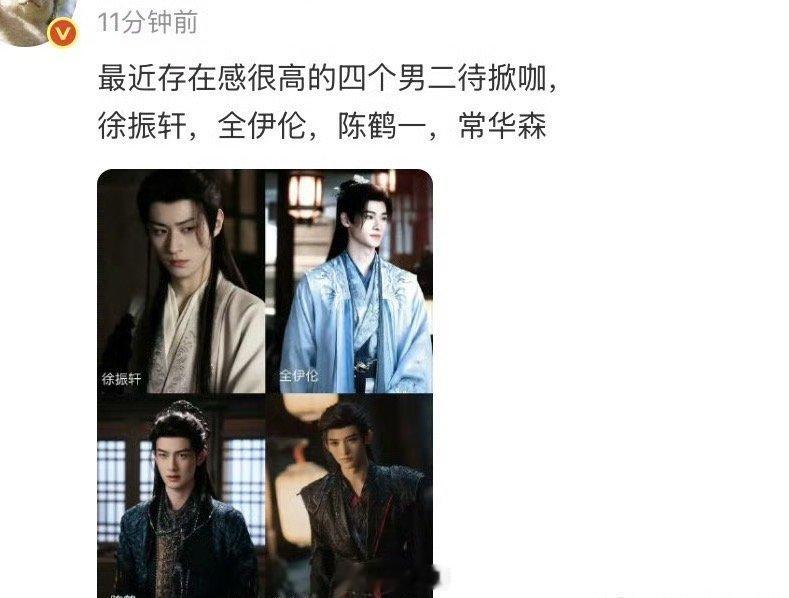 就是说新剧还没播完,就已经感受到想要掀桌的节奏了啊!网友总结了内娱最近存在感很高的四位男二号:常华森、全伊伦、陈鹤一和徐振轩,古偶剧的造型都挺出圈的。就是说谁能顺利掀桌啊!