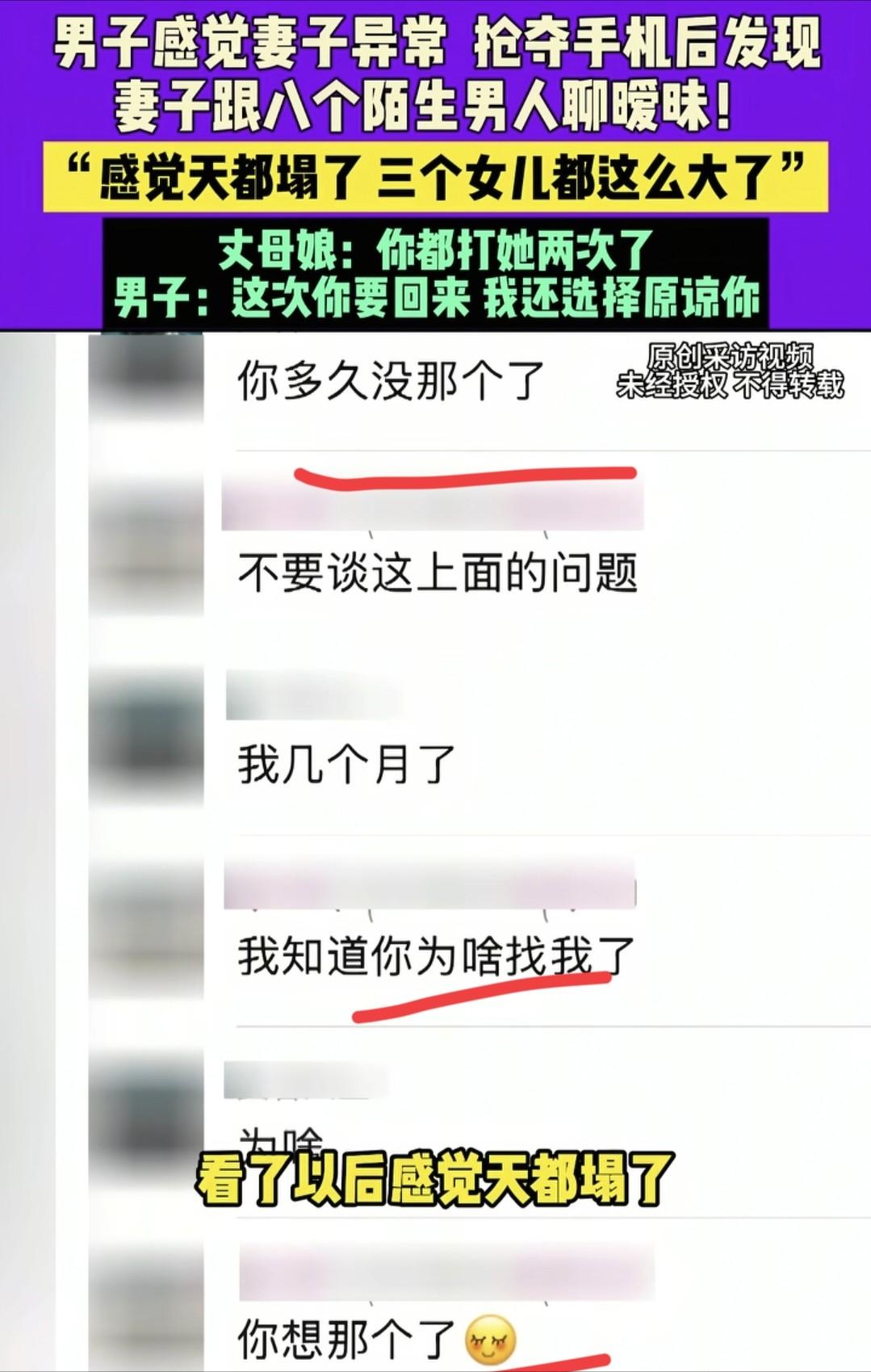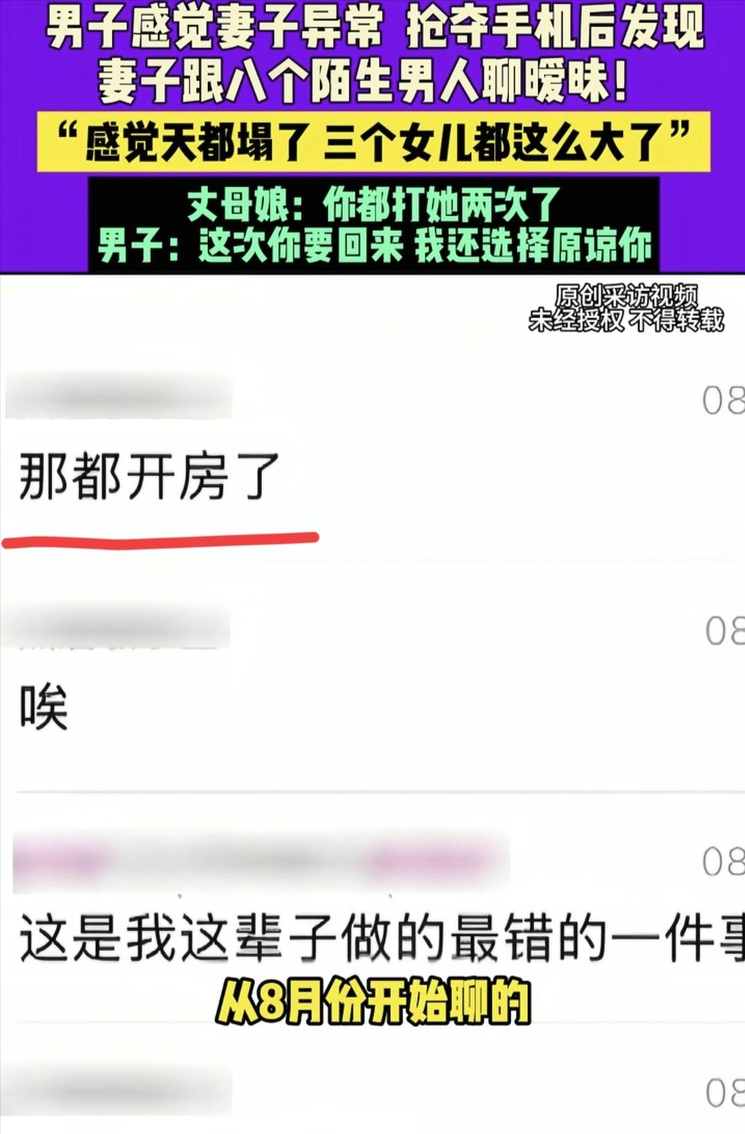 河南开封,男子发现妻子不对劲,把她手机抢过来一看,她跟8个陌生男人聊暧昧,还偷偷跟男人见面,男子感觉天都塌了!三个女儿都这么大了,妻子竟然给自己戴绿帽,气的他动手打了妻子,妻子便离家出走,男子无奈喊话妻子:为了孩子,你这次回来,我原谅你。 河南开封的王磊(化名)这辈子都忘不了那个晚上,他一把抢过妻子李娟(化名)的手机,解锁屏幕的瞬间,密密麻麻的暧昧消息差点让他背过气去 ——8 个陌生男人的对话框里,“老公”“想你” 之类的字眼随处可见,还有好几张和不同男人的见面合影,背景是他从没去过的咖啡馆和酒店。 38 岁的王磊和李娟结婚 12 年,三个女儿最大的 11 岁,最小的才 5 岁。作为货车司机,他常年跑长途,总觉得拼命赚钱给家里更好的生活就是对妻子最大的爱。可从半年前开始,李娟变得越来越不对劲。以前他出车回来,妻子总会提前做好热饭,现在迎接他的只有冷锅冷灶,问起来就说 “忘了做”。 夫妻间的亲密也成了奢望。王磊累了一天想和妻子说说话,李娟总是抱着手机躲在阳台,屏幕还调得特别暗,问她在干嘛,就不耐烦地说 “刷短视频”。有一次大女儿发烧到 39 度,王磊在外地急得团团转,打电话让李娟送孩子去医院,她却支支吾吾说 “在忙”,后来才知道那天她根本没在家,是邻居帮忙送的医。 李娟的脾气也变得异常暴躁。以前家里的小事她都愿意和王磊商量,现在哪怕他多说一句,就会被劈头盖脸一顿骂,说他 “没本事”“不懂情趣”,对比之下,手机里的陌生男人总能把她哄得开开心心。王磊后来才反应过来,那些男人会记住她的生日,会听她唠叨家长里短,这些他因为忙碌早就忽略的细节,成了别人趁虚而入的缺口。 矛盾在 10 月 18 日彻底爆发。那天王磊提前从外地回来,想给妻子一个惊喜,却看到李娟打扮得光鲜亮丽正要出门,手机随手放在了客厅茶几上。屏幕突然亮起,一条 “老婆什么时候到,房间订好了” 的消息弹了出来,王磊的血一下冲到了头顶,他一把抓起手机,用两人的结婚纪念日解开了锁。 聊天记录里的内容比他想象的更不堪。8 个好友备注五花八门,有 “张哥”“李总”,还有直接叫 “亲爱的” 的,最早的聊天记录能追溯到三个月前。李娟不仅和他们聊暧昧,还在半个月前和其中一个男人去了郑州,机票和酒店订单都存在手机里。更让他崩溃的是,有个男人问她 “三个孩子怎么办”,她回复 “等时机成熟就离婚”。 怒火攻心的王磊没等李娟解释,抬手就给了她一巴掌。这不是他第一次动手,半年前发现李娟和人暧昧不清时,他就打过一次,当时李娟哭着保证再也不会了,他看在孩子的面子上选择了原谅。可这次,李娟捂着脸说了句 “那就离婚”,抓起包就冲出了家门,再也没回来。 王磊找到丈母娘家要人,没想到丈母娘指着他的鼻子骂:“你都打了她 2 次了,换谁能忍?她是有错,你就没错吗?” 这句话像一盆冷水浇醒了王磊。他坐在沙发上回想这些年,确实因为跑长途忽略了妻子的情绪,李娟生病时他只让她 “多喝热水”,孩子家长会他一次没去过,家里大小事全靠李娟一个人扛,她的委屈他从来没认真听过。 现在家里乱成了一团。大女儿每天放学回来就问 “妈妈什么时候回来”,小女儿夜里抱着妈妈的枕头哭,王磊既要跑车又要照顾孩子,根本忙不过来。他对着镜头录了段视频,红着眼眶喊话妻子:“我知道我以前忽略了你,我也有错,只要你回来,我原谅你,咱们好好过日子,别让孩子没有妈妈。” 视频发出去后,有人骂李娟不负责任,也有人说王磊动手不对,更不该用孩子绑架妻子。王磊自己也很迷茫,他不知道妻子会不会回来,也不知道就算回来了,这段布满裂痕的婚姻还能不能修复。 对此,你们有什么看法,欢迎评论留言~