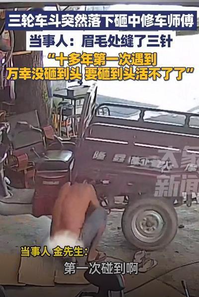 修车时突遭“断头杀”! 家人们,真不是吓唬你们,修个车竟然差点把命搭进去! 就在前两天,云南德宏一位修车师傅,干了十几年的老手了,结果在检查一辆三轮车的时候,后斗“哐当”一下直接砸了下来!他当时正蹲在地上,根本来不及反应,脖子和脸瞬间就被砸中,整个人当场懵了! 你想想那场面多吓人——铁皮车斗从上面直愣愣砸下来,血哗一下就流出来了。送到医院一查,眉毛那儿缝了三针!要不是脑袋歪了一下,躲开了最致命的位置,这会儿都不敢想会成啥样。 他自己都说,从业这么多年,头一回碰上这种事。平时觉得三轮车没啥大问题,拧拧螺丝、换换零件,都是家常便饭。可谁想到,一个看似牢固的车斗,可能因为年久失修、螺丝松动,说掉就掉! 这不是技术问题,这是保命的问题啊!很多修车师傅图省事,没打支撑就直接往车底下钻,万一车子哪部分塌了,那可真是叫天天不应!这回是运气好,再下次呢?还能这么侥幸吗? 每一个在太阳底下挥汗如雨的劳动者,都不该拿命去赌一点点疏忽。安全措施不是摆设,是救命的底线!进车间必须戴防护、该撑的千斤顶绝不能省,别等出事才哭着后悔。 真心希望这位师傅早日康复,也提醒所有干汽修的朋友:手里的扳手再熟,也别忘了头顶上的危险! 这样的事,真的不该发生第二次!如果你觉得说得对,点个赞,转发给身边开车、修车的人看看!多一个人看到,就少一分风险! 修车惊魂 安全无小事 劳动者请注意 真实事件 危险瞬间 创作不易,感谢大家的支持!每日更新❤ 【免责声明】 文章的时间、过程、图片均来自于网络,文章旨在传播正能量,均无低俗等不良引导,请观众勿对号入座,并上升到人身攻击等方面。观众理性看待本事件, 切勿留下主观臆断的恶意评论,互联网不是法外之地。本文如若真实性存在争议、事件版权或图片侵权问题,请及时联系作者,将予以删除。谢谢