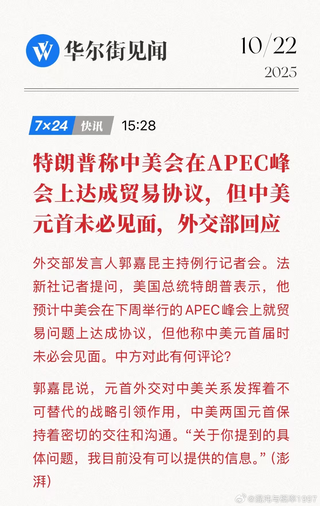特朗普称中美会在APEC峰会上达成贸易协议,但中美元首未必见面,外交部回应 ​​​