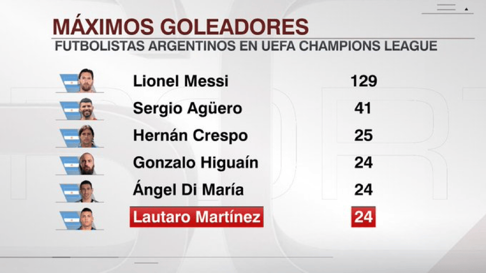根据ESPN的统计,劳塔罗是历史上欧冠进球并列第四多的阿根廷球员: