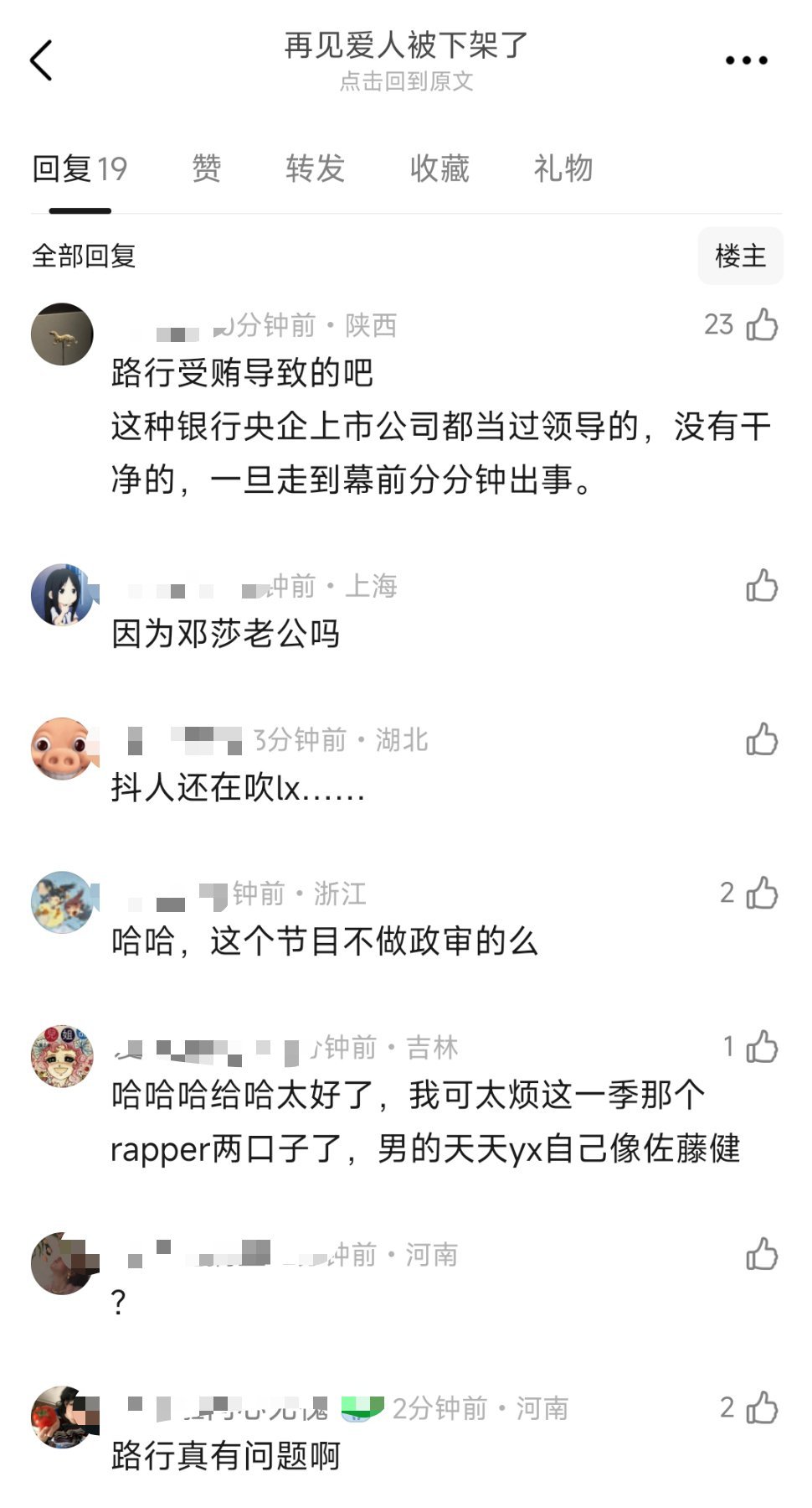 有瓜说芒果的再见爱人要下架了……本来以为突然有个讨论度大的综艺能让内娱活跃下,结果刚播完第一期就送走了……节目组背调怎么做的[允悲]邓莎老公塌房