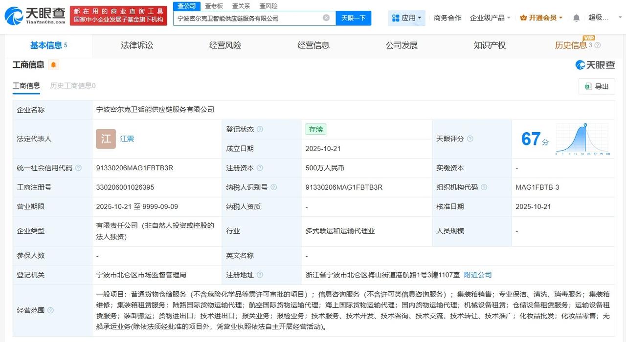 密尔克卫在宁波成立智能供应链服务公司注册资本500万 天眼查App显示,近日,宁
