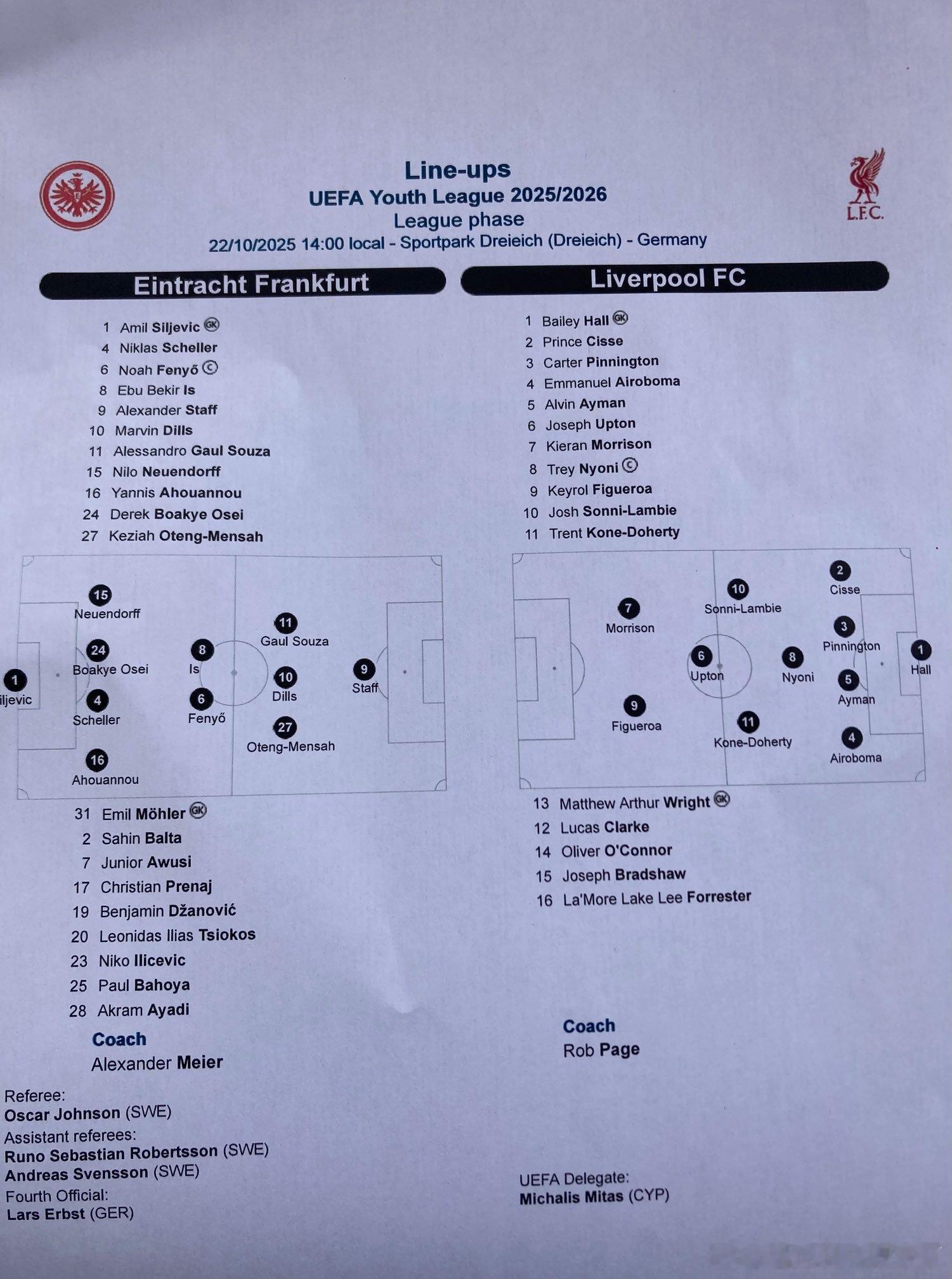 利物浦U19对阵法兰克福U19,尼奥尼队长并且踢后腰多赫蒂在左边莫里森改