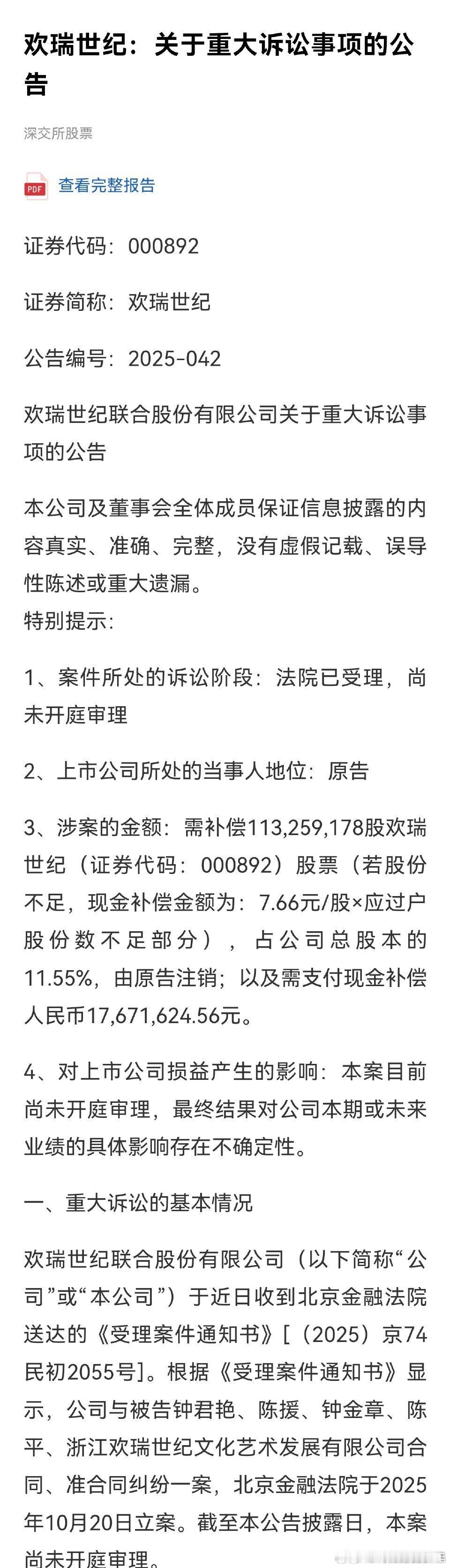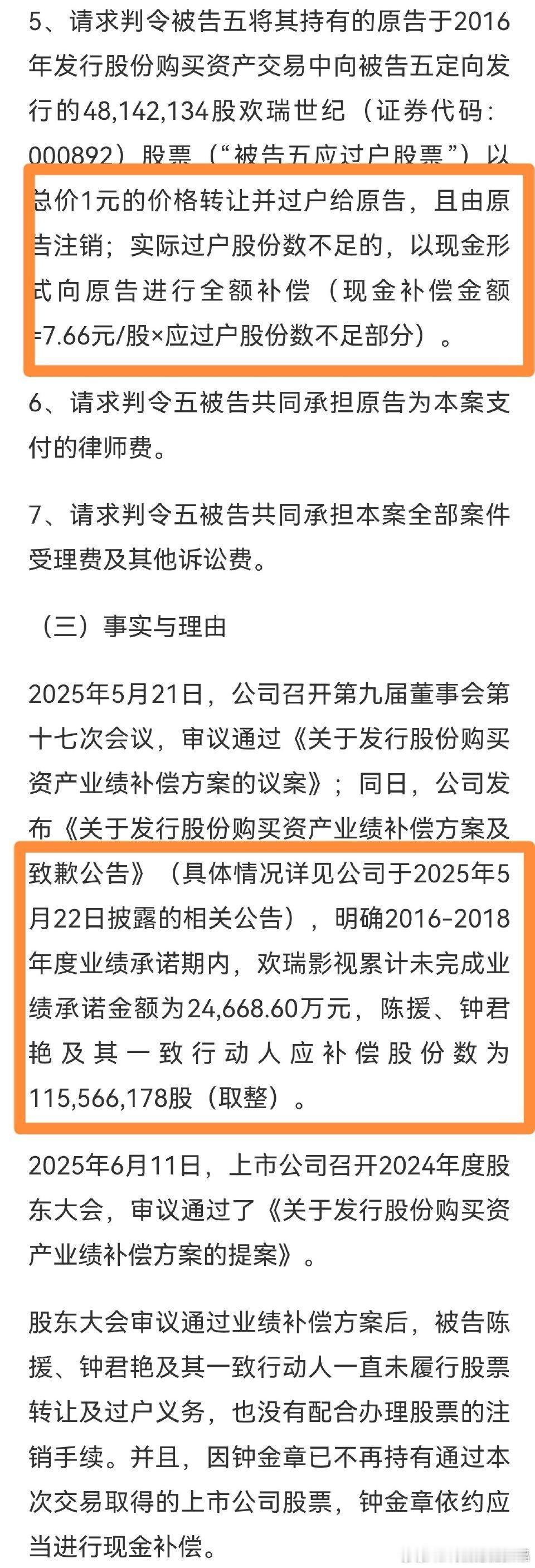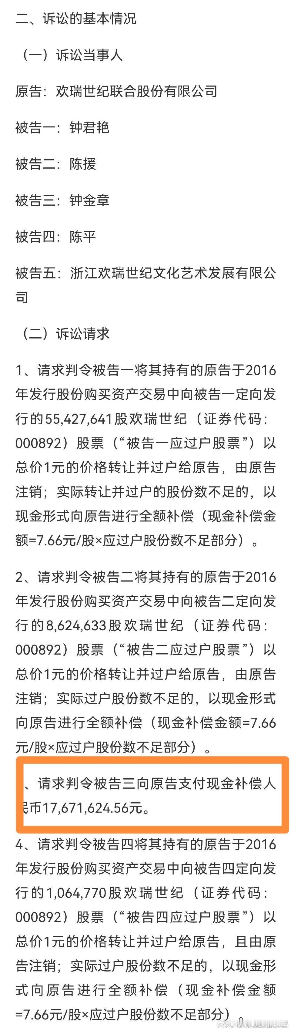 欢瑞世纪发布公告,钟君艳和她父亲还有老公被欢瑞世纪告了,北京金融法庭于10月20日刚立案,尚未开庭审理。 欢瑞要求五位被告补偿上市公司股票11326万股,还有现金补偿1767万元🍉🍉