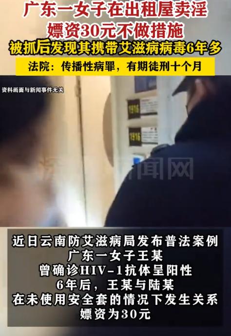“天塌了!”10月21日报道,广东东莞,一男子花30元找一女子进行卖淫服务。可谁能想到,在此过程中,两人被前来巡查的民警逮了个正着。更让男子崩溃的是,对方竟已患艾滋病长达6年。     陆某(化名)在一家工厂上班,那天刚领了工资,晚上和几个工友喝了点酒。     喝完酒,他自己骑车回出租屋,走到一条安静的小巷时,看到路边站着王某。     王某化名走过来跟他搭话,说只要30块钱就能“解决问题”。     陆某一时头脑发热,就答应了,跟着王某回到她租住的民房。     路上,陆某脑子里还在想着白天的疲惫和酒意,没多想后果。     他跟着王某走得小心翼翼,但也没想到这一步会让自己陷入麻烦。     王某开门的时候,屋里光线昏暗,墙角堆着一些杂物和床铺,显得破旧而凌乱。     陆某当时只想着快点完成,却没意识到,这个决定可能改变他接下来的几个月,甚至几年生活。     刚准备开始,门口就有人开始敲门,开门一看,是巡逻民警。     两人当场被抓,来不及说什么。     陆某起初只是觉得倒霉,想着被抓也就是拘留、罚款,可接下来的调查彻底让他慌了神。     民警按程序对两人进行询问和检查。     问到王某的健康状况时,她支支吾吾的样子让民警起了疑心。     随后王某被送到东莞市疾病预防控制中心做检测,结果很快出来了,她的HIV-1抗体呈阳性,证实是艾滋病毒携带者。     更让人震惊的是,调查发现王某早在6年前就被确诊感染了艾滋病,这些年她一直知道自己有病。     陆某得知这个消息后整个人都崩溃了。     他和王某交易的时候没有采取任何防护措施,而无保护的性接触正是艾滋病最主要的传播途径之一。     一想到可能感染,他腿都软了,不停自责:“我怎么这么傻。”     他后来才知道,感染艾滋病后的生活非常煎熬:先是急性感染期,可能发烧、乏力,接着是无症状期,心理压力巨大。     一旦进入艾滋病期,免疫系统会崩溃,各种感染和肿瘤都会找上门,生活质量直线下降。     更糟糕的是,现在还不能确定是否感染,只能等窗口期结束后反复检测,这段等待的日子简直像折磨。     而王某也为自己的行为付出了代价。     东莞市第一人民法院审理认为,她明知自己患有艾滋这种严重性病,还从事卖淫活动,已经构成传播性病罪。     法院考虑到王某归案后如实供述,认罪态度较好,最终判她有期徒刑十个月,并处罚金2000元。     这30块钱的嫖资,让她换来了近一年的牢狱之灾和一生难磨的犯罪记录。     陆某虽然没犯罪,但也逃不过治安处罚。     根据治安管理处罚法,嫖娼会被拘留十到十五天,可能还会罚款五千元以下。     不过对他来说,拘留和罚款都不算什么,真正折磨他的是无休止的恐惧和后悔。     网友评论说:“这哪是占便宜,分明是拿命赌,30块钱买个终身心理阴影,太不值了。”     这件事虽然落幕,但教训足够深刻:嫖娼违法,背后的健康风险可能致命。     别以为“便宜”或“侥幸”就能躲过一劫,一旦踩到法律和健康的红线,代价可能一辈子都受不了。     正如网友说的:“30块钱买不来方便,只能买来麻烦和风险。”     这起案件提醒大家,保护自己,遵守法律,才是最实际的自我保障。     对此你怎么看?     信源:深圳新闻网