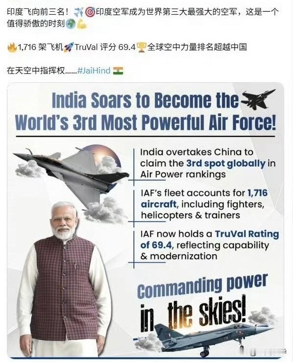不是开玩笑,认真的,国外一个机构发布各国空军排名,其中印度位于美国和俄罗斯之后,也就是全球第三,一时间印度媒体沸腾了,各种报道,印度人也非常开心,完全忘记了上半年,被巴基斯坦击落7架战斗机的事情,其实这个排名,一点也不严谨,说白了,就是为了诋毁某国,印度没有制造四代机和五代机的能力,更没有装备隐身五代机,轰炸机也没有,飞机数量也不多,所以排在第三,有点好笑,排在第三的印度,连续两次空战,却打不过排在十名之外的巴基斯坦,反正印度人开心就好,下次印巴空战,估计印度飞机还会被击落。