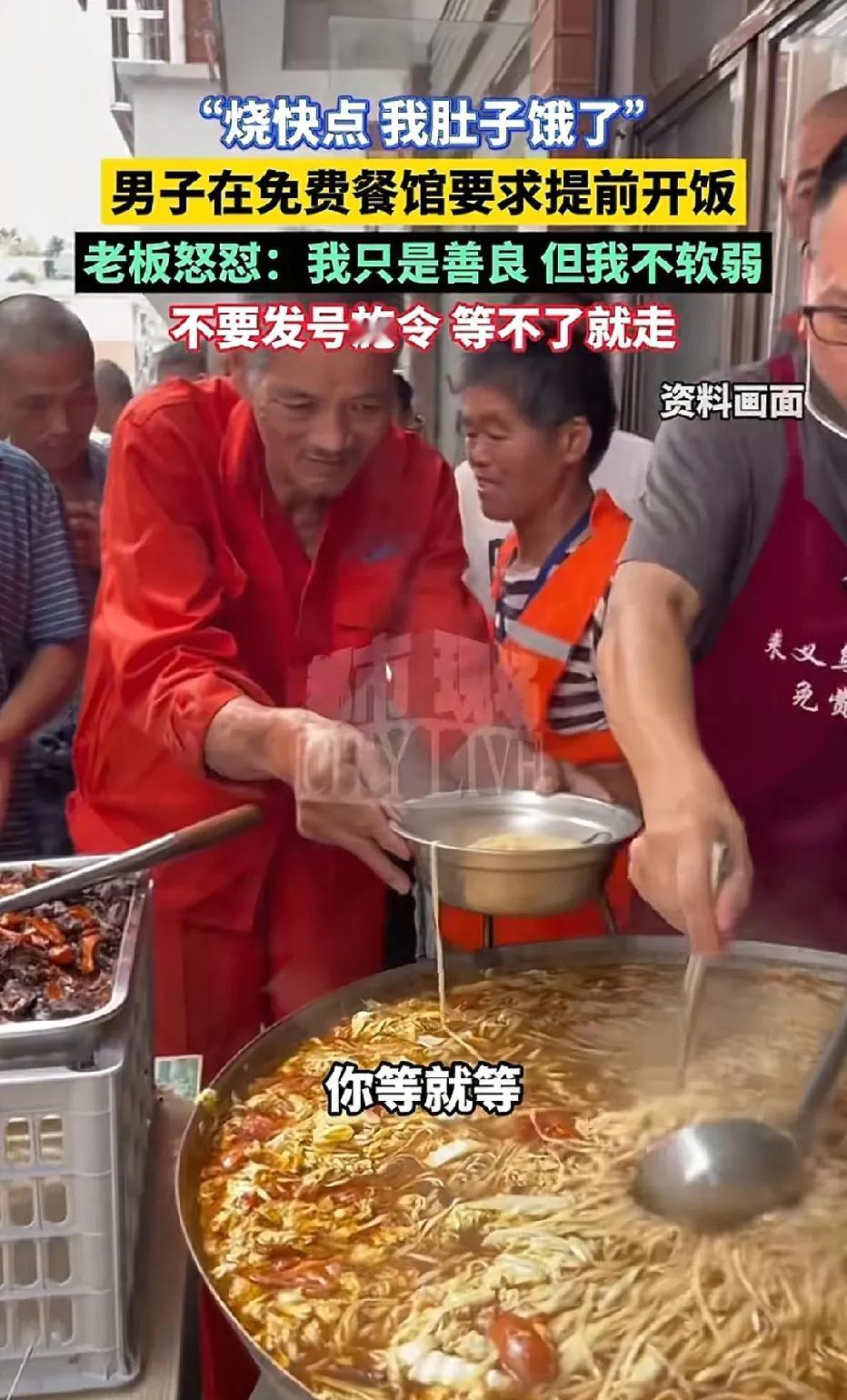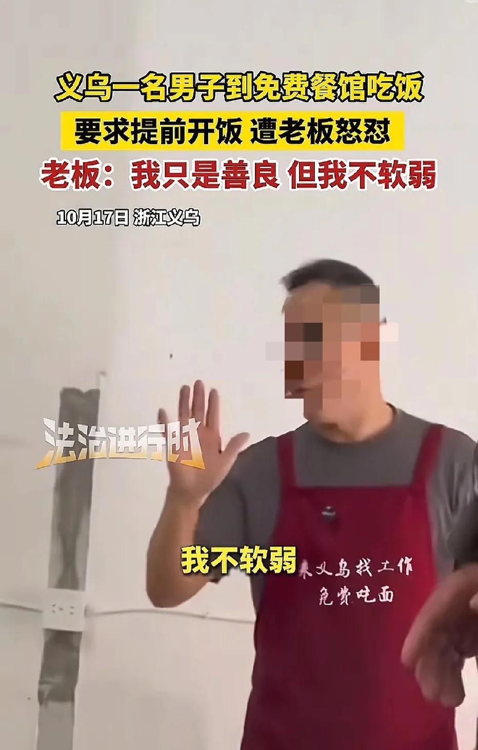 浙江义乌,男子到免费饭馆吃饭,去到那里发现还没开饭,他两手叉腰,当场催促老板提前开饭,遭到老板怒怼:我只是善良,但我不软弱。不要来我这里发号施令,你要等就等,不等就去哪就去哪,事后,老板的反应亮了。 据悉,2006年,杨老板揣着几百块钱来义乌打拼,从最底层的外贸实习生做起,天天熬夜谈客户、跑市场,吃了不少苦。 他刚来时找不到工作,连续三天就靠啃干面包填肚子,大冬天甚至缩在桥洞下过夜。 那时候他就想,要是有人能给口热饭吃,该多好啊。 这个念头搁在心里十几年,2024年11月,他终于付诸行动。 自己掏了3万块钱租了个40平米的小店,每天亲自去菜市场挑食材,雇了两个志愿者帮忙,专门给有需要的人做面条、盒饭。 每天11点准时开饭,这个规矩,近一年来从没变过。杨老板常说:我不图别的,就想让那些辛苦的人,能吃上口热乎的。 可没想到,好心办好事,还能遇到不讲理的。 10月16号上午10点多,饭馆里正在忙着准备午饭,门“哐当”一声被推开了。 一个男人闯进来,扫了一眼空桌子,立马就炸了:老板!不是说10点吃饭吗?这都几点了,故意饿人是吧? 杨老板正切菜呢,赶紧擦了手出来解释:大哥,咱这儿一直是11点开饭,你可能听错了。再等会儿,饭菜马上就好。 男人双手一叉腰,语气特别冲,他们说10点开饭呀,怎么10点了还不做饭。烧快点,我肚子饿呀!再给我几个垃圾袋,要去捡瓶子。 旁边帮忙的志愿者都看傻了,这免费吃饭还吃出脾气了? 杨老板脸上的笑也没了,盯着男人,无奈说道,你说这话真的是,我跟你说呀,我只是善良,我不软弱,你不要在我这里发号施令好不好,等得了就等,等不了你就走。 男子听了,情绪也慢慢稳定了,意识到自己说话太冲了。 他瞬间就蔫了,看着杨老板的眼神,又看看志愿者们忙前忙后的样子,脸一下子红到了脖子根。 沉默了好一会儿,他低着头走到杨老板面前,声音蔫蔫的:老板,对不起……我早上没吃饭,找工作又碰壁了,一时没控制住情绪,不该冲你吼的。 杨老板看他也挺不容易的,气也消了大半。他拍了拍男人的肩膀,对志愿者说:先给这位大哥倒杯热水,拿两个馒头垫垫肚子。 然后转头对男人说:出门在外都不容易,有难处好好说,别把别人的好心当成理所当然。 男人拿着热水和馒头,眼圈都红了,一个劲儿地道谢。 中午11点开饭的时候,他还主动过来帮忙收拾桌子,又跟杨老板道了一次歉。 后来,此事被人曝光到网上,而老板也很坦然回应,男子没有恶意,也到道歉了,他们都是打零工的,不容易,不要对这件事过分关注。 有网友说,免费的饭是情分,不是本分。杨老板的善良带着棱角,还能顾及到别人的感受,这份格局真大。 也有网友认为,有些人总是把别人的善意当做理所当然。 《治安管理处罚法》第23条规定:,对扰乱机关、团体、企业、事业单位秩序,致使工作、生产、营业、医疗、教学、科研不能正常进行,尚未造成严重损失的,可处警告或罚款;情节较重的可处拘留并处罚款。 若男子的行为导致餐馆备餐节奏被打乱、其他就餐者受到影响,就违反了该条款。 本案中,男子未使用侮辱性言辞等超出必要限度的方式,一般不构成违法。 《民法典》第657条规定:赠与合同是赠与人将自己的财产无偿给予受赠人,受赠人表示接受赠与的合同。 老板开爱心餐馆免费供饭,属于将自己的财产食物无偿给予他人,符合赠与合同的特征。在这种情况下,赠与合同成立后,老板作为赠与人,不能随意要求客人受赠人承担费用。 爱出爱返,杨老板免费餐馆曝光后,也收获了很多正能量,很多热心网友无私捐款了很多食材,希望把爱心公益传递出去。 对此,你怎么看?