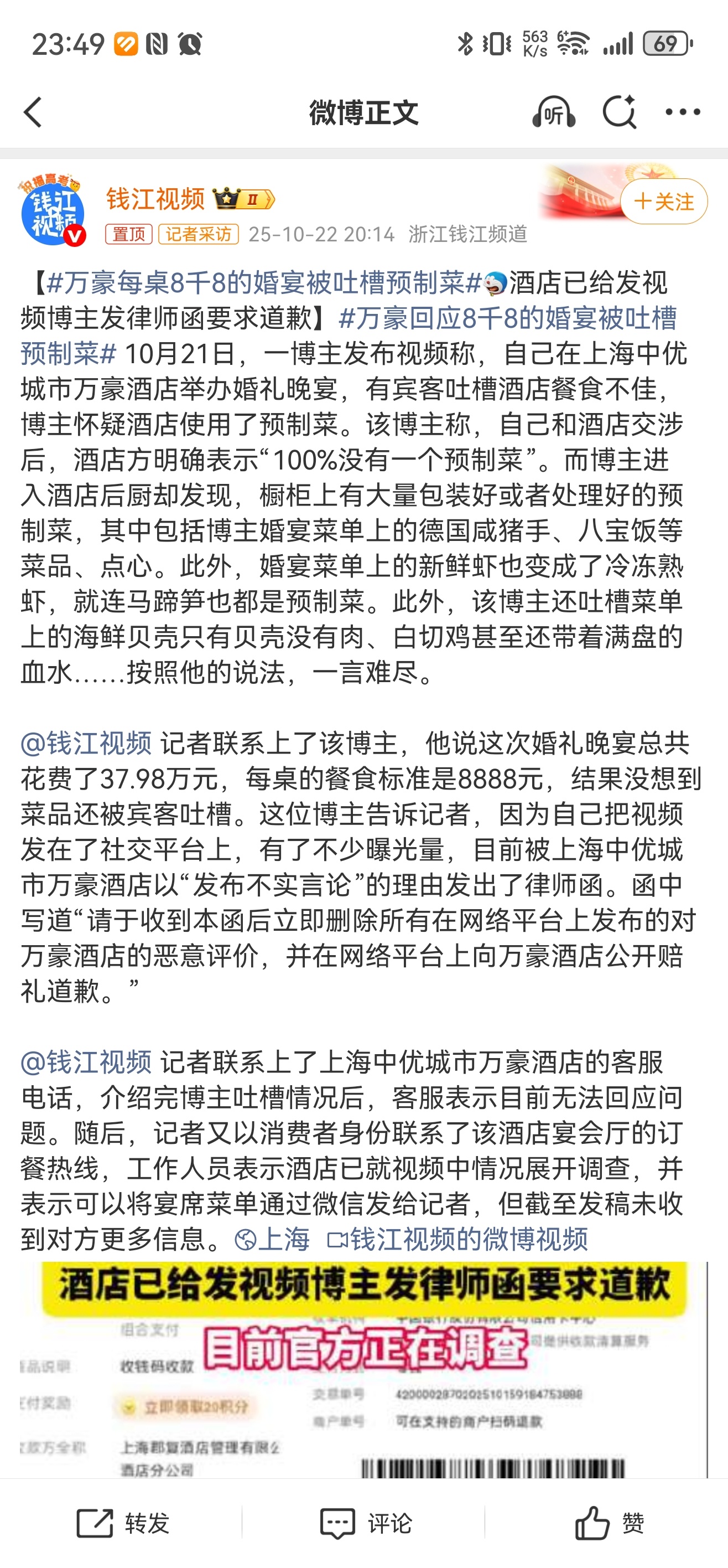万豪每桌8千8的婚宴被吐槽预制菜,这事儿我一点都不意外,现在酒店婚宴哪还有几家是真刀真枪现场炒的?基本全是预制好的成品,师傅最后热一热、摆个盘就上桌。[允悲]除非你回老家那种大席,几个大锅齐开火,现场油烟一上,味儿才算对。城里这些高端婚宴,看着体面,实则“中央厨房出品”,吃的更多是仪式感。[doge]