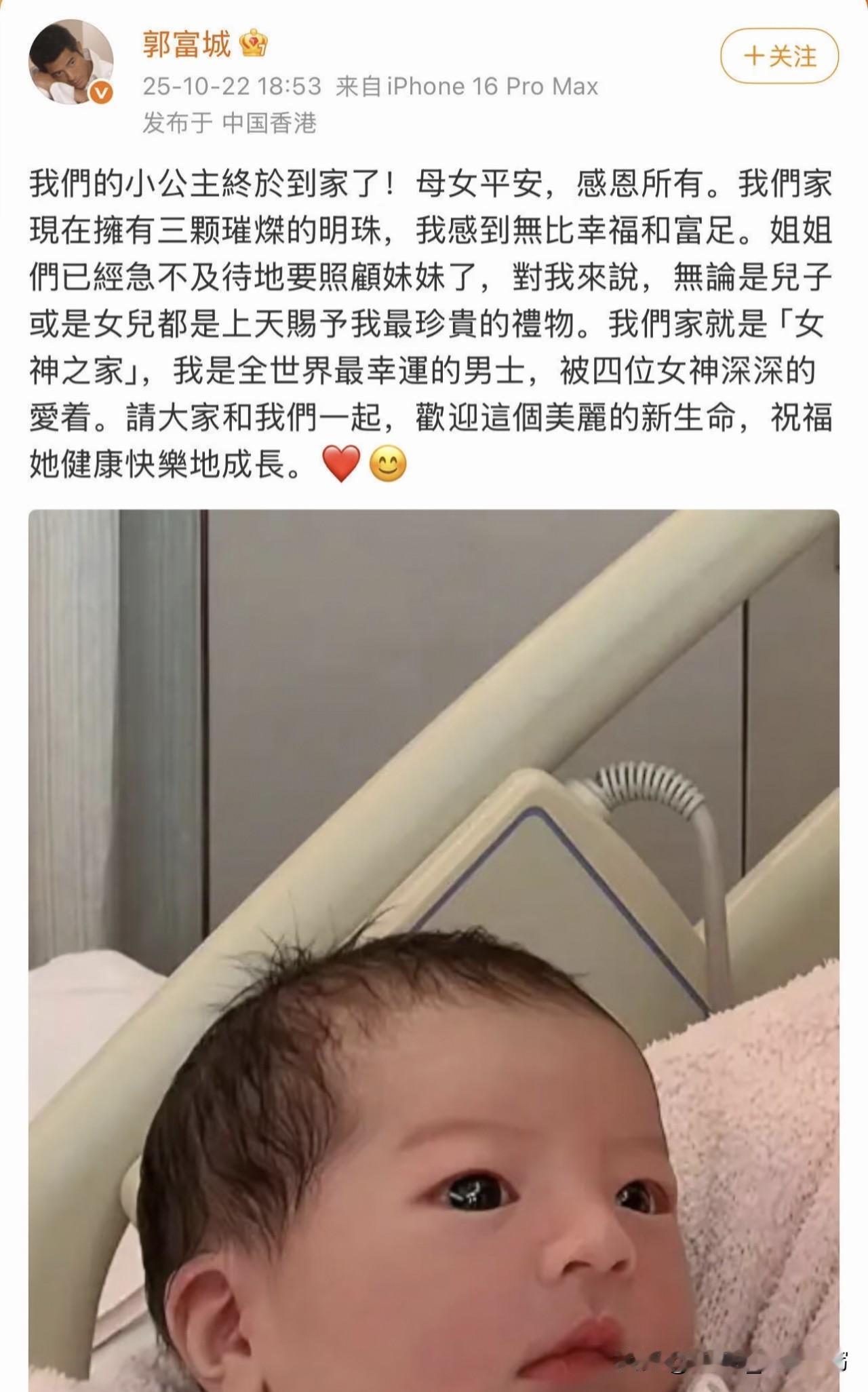 郭富城三胎出生,结果一揭晓,全网都笑趴了! 不是儿子,又是小公主! 这下可好,四大天王清一色全是女儿奴,还是一个儿子都没有。 你说郭富城开心吧,是真开心,可最乐的,估计是刘德华、张学友、黎明那三位。 终于不用被“比下去”了,大家齐齐当岳父,谁也别得意! 想想看,四位天王的女儿将来要是真像网友说的那样结拜姐妹, 那画面太美:星二代+高颜值+爹宠上天,妥妥的“天王千金团”出道! 其实生男生女有啥区别? 看这些天王对女儿疼得那样,扎辫子、陪跳舞,比当年开演唱会还认真! 女儿就是小棉袄,暖心得很! 你说是不是?对此你怎么看?
