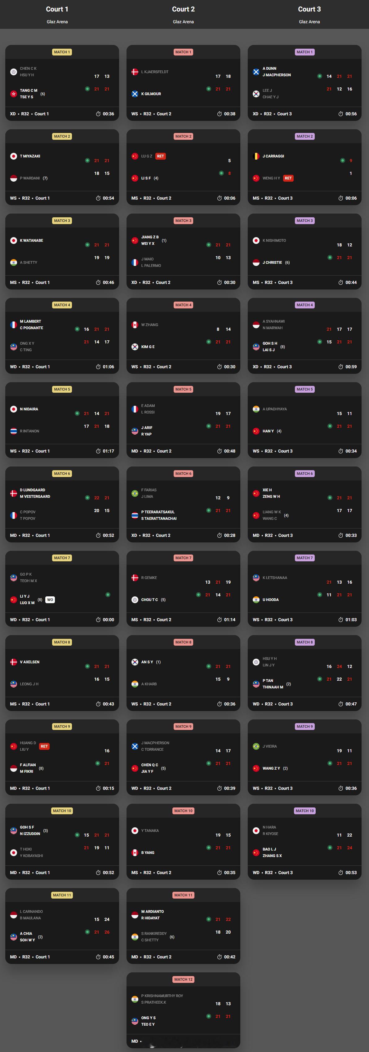 【法国羽毛球赛22日国羽9胜5负】2025年法国羽毛球公开赛羽联超级赛10月22日瑟松塞维涅,2025世界羽联超级750法国公开赛结束第二比赛日,国羽9胜5负。国羽赛果如下,完全赛果见图: