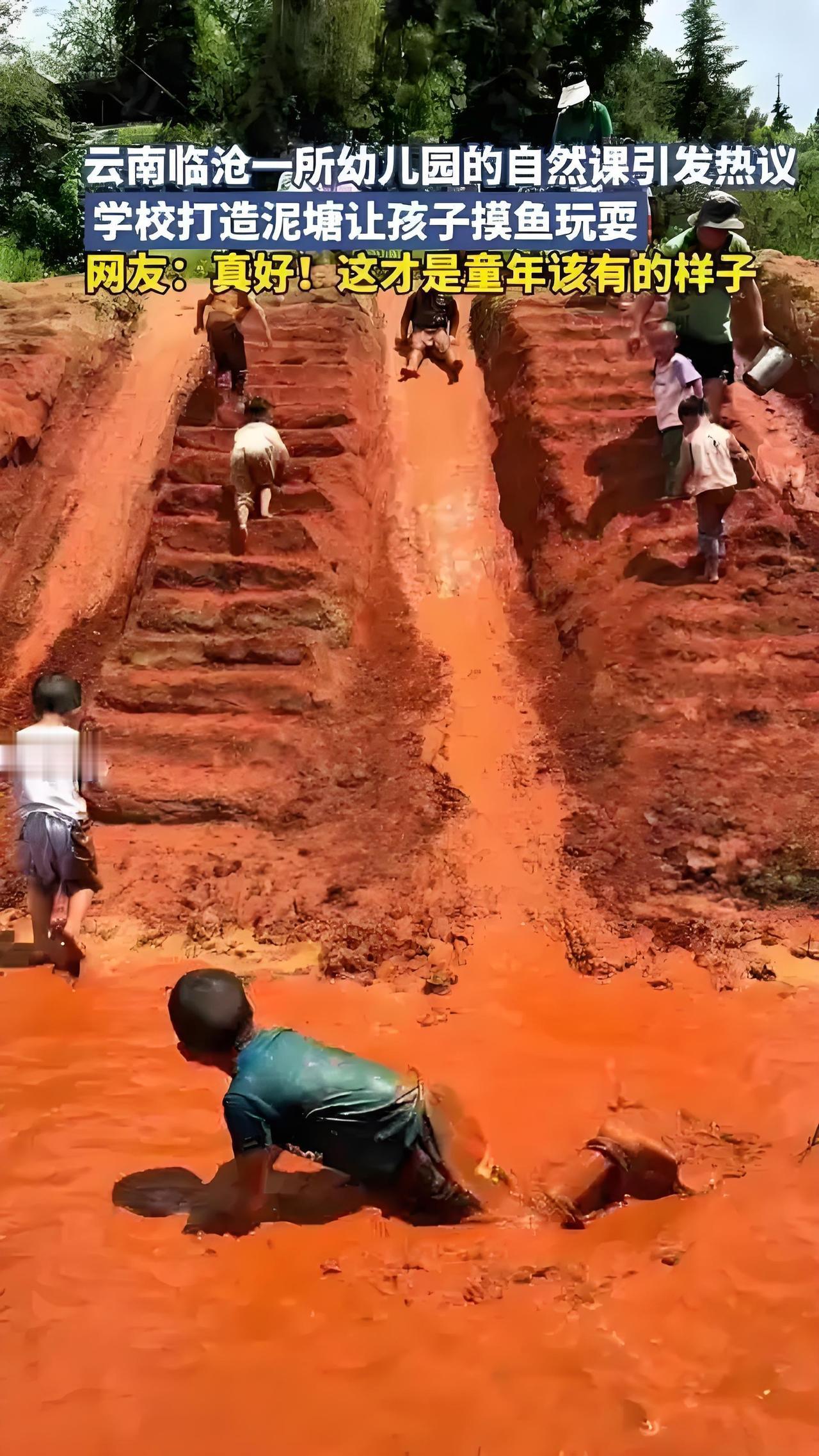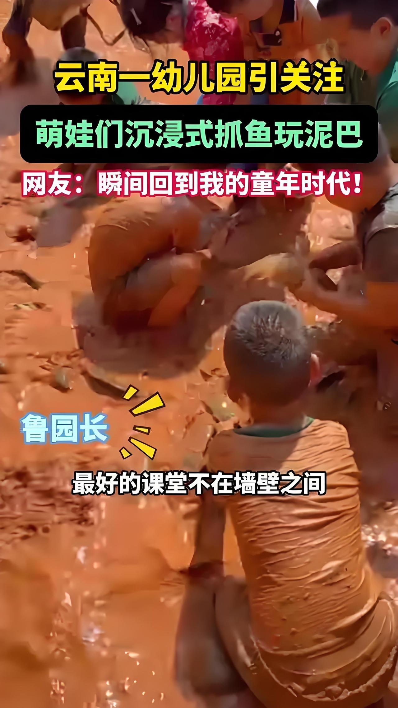 云南临沧一家幼儿园最近火了,他们搞了个特别棒的自然课:直接在院子里挖了个泥塘,放上小鱼,让小朋友们光着脚丫下去摸鱼。 视频里孩子们浑身是泥,追着鱼跑,笑得特别开心。这视频一下就爆了,播放量上百万,好多人点赞转发,都说“这才是童年该有的样子”。 说真的,现在城里孩子太可怜了,整天关在屋里,玩的是塑料玩具,连泥巴都没摸过。我们小时候哪是这样?田里摸泥鳅,水坑里踩水,回家一身泥被老妈骂,但那种快乐是实实在在的。现在的孩子只能在平板电脑上看动物世界,这哪比得上亲手抓条鱼来得真实? 可能有人嫌脏,怕孩子摔着。但成长不就是磕磕绊绊过来的吗?在泥塘里玩,既能锻炼身体,又能培养勇气和反应能力。比坐在教室里死记硬背“鱼生活在水里”有意思多了,这种体验能记一辈子。 我觉得教育就该这样,别老把孩子裹在塑料泡沫里。脏一点没关系,重要的是让他们真实地感受这个世界。这幼儿园的泥塘里,装的不是鱼,是孩子们丢失已久的童年。 你小时候玩过泥巴吗?觉得这种课该不该推广?评论区聊聊你的看法。