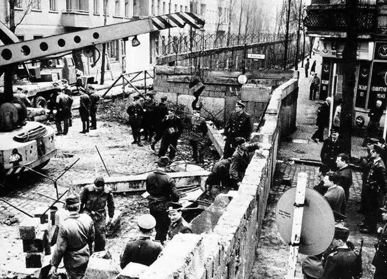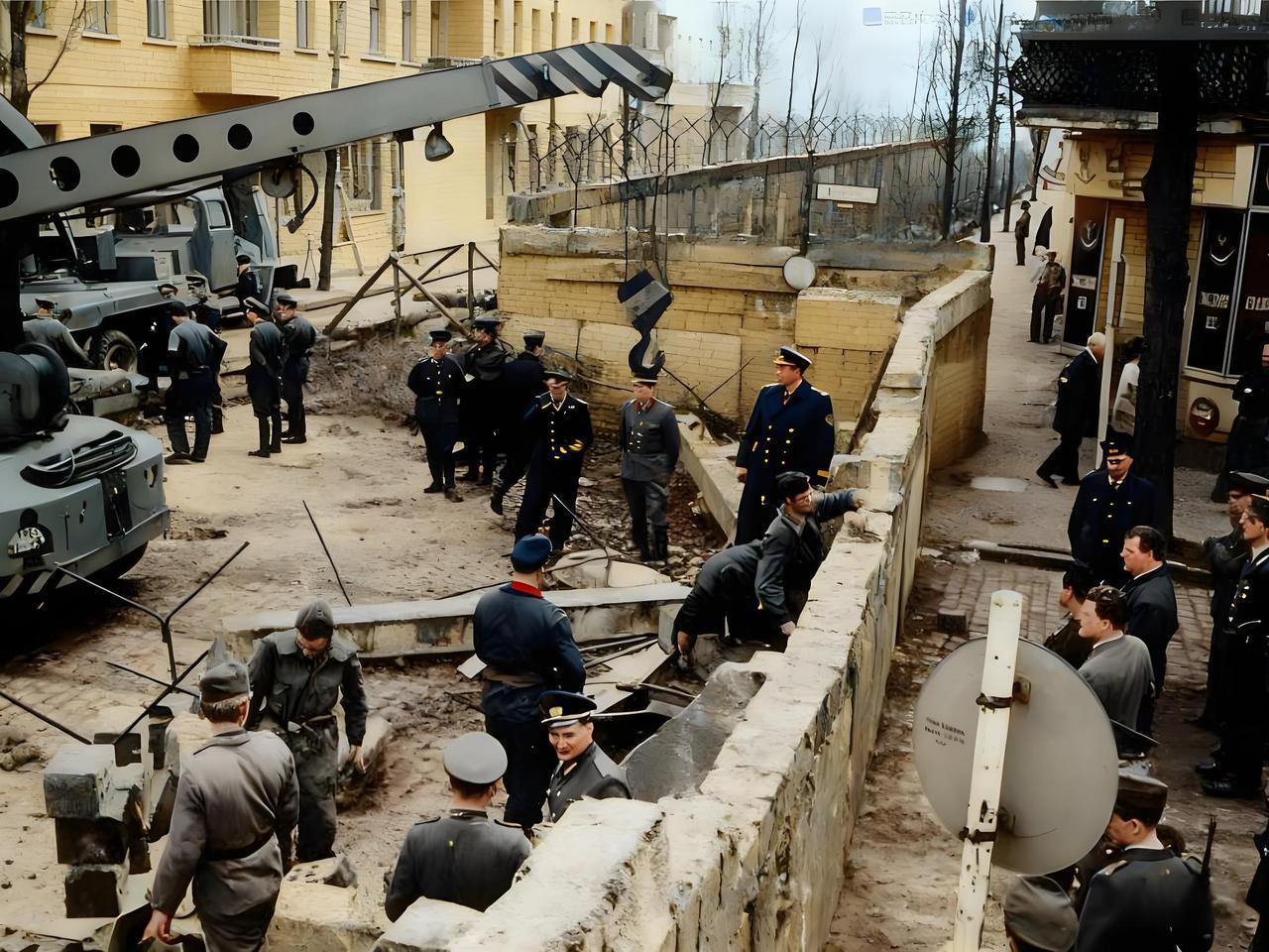 这张照片记录的是1961年柏林墙建造期间的历史场景,是冷战时期德国分裂与美苏对抗的标志性影像之一。 1961年8月13日,东德(德意志民主共和国)为阻止公民西逃,开始在东西柏林边境修建柏林墙。此前,约300万东德人通过西柏林逃往西德,导致东德经济和人才严重流失。这张照片捕捉到了墙刚动工的关键阶段,是冷战从“意识形态对抗”升级为“实体隔离”的直观体现。
