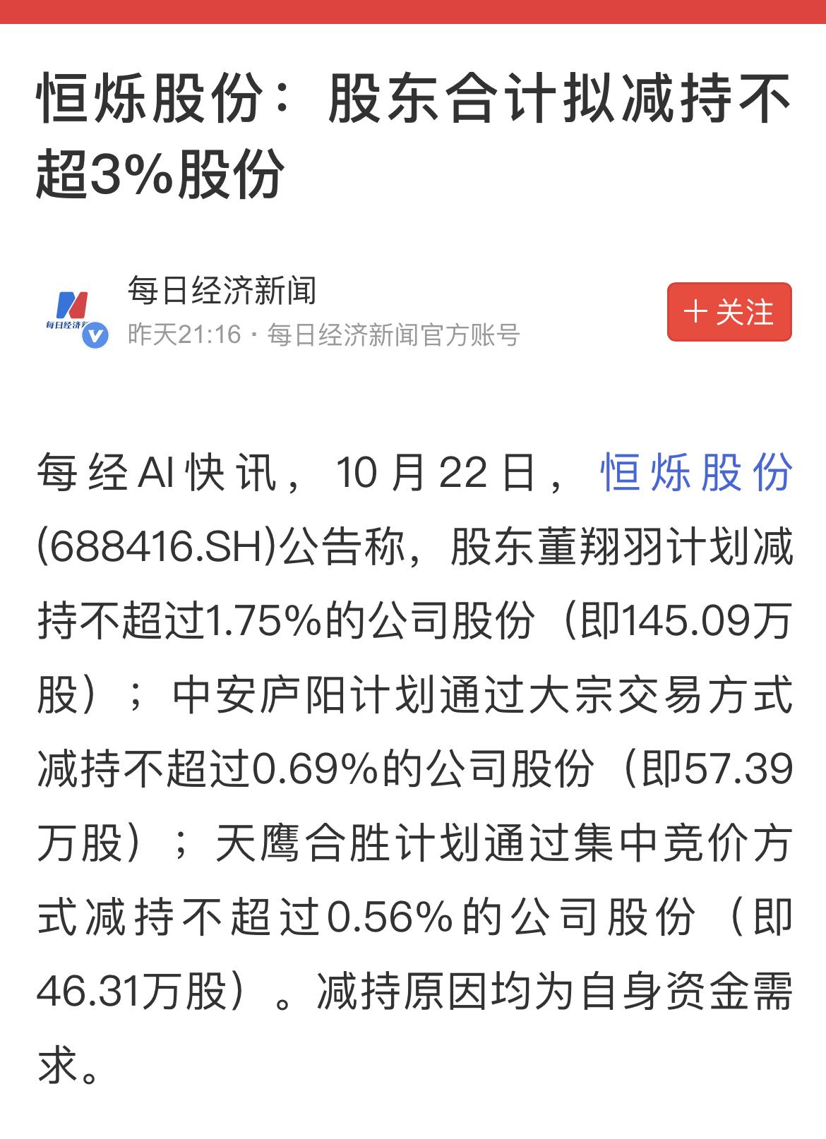 恒烁股份上市3年。 连续两年亏损! 一年之内,股价涨幅2倍! 昨晚公告:三大股东总共减持不超3%!