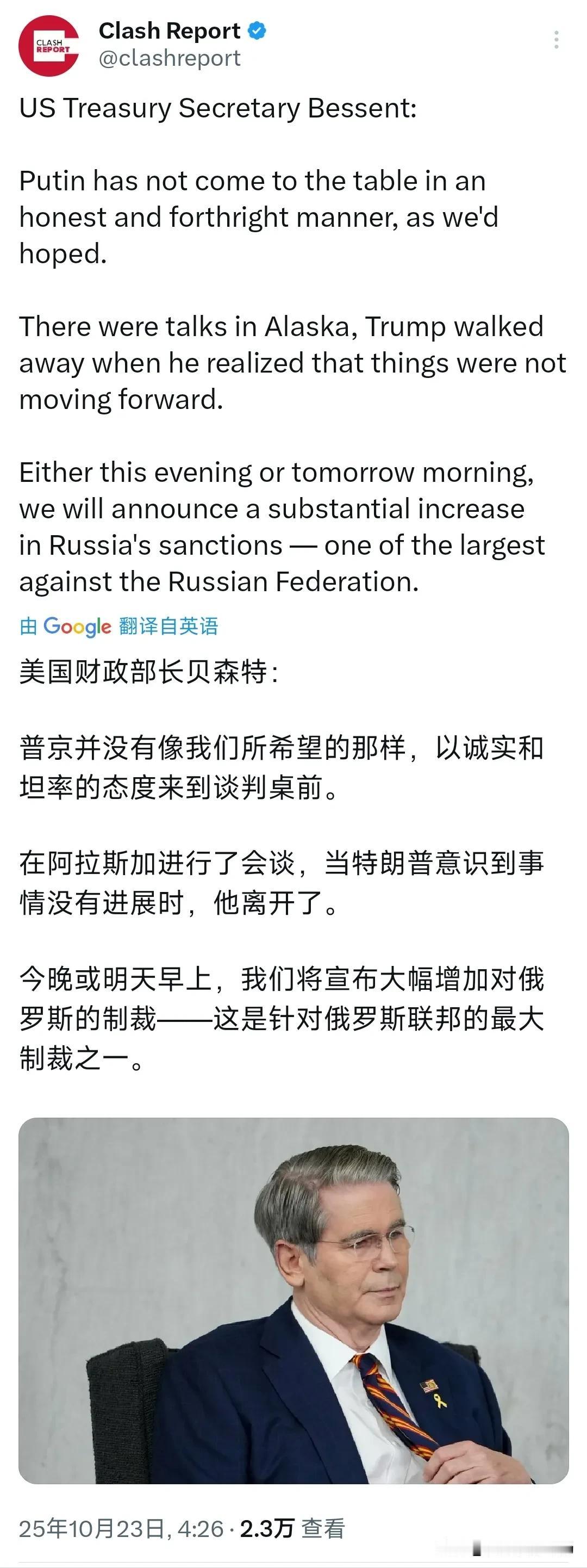 美国财政部长贝森特今天(10月23日)发文说:“现在是停止杀戮、立即停火的时候了。 鉴于普京总统拒绝结束这场毫无意义的战争,财政部正在制裁为克里姆林宫战争机器提供资金的俄罗斯两家最大的石油公司。 如果有必要,财政部准备采取进一步行动,支持特朗普总统结束又一场战争的努力。我们鼓励盟友加入我们,遵守这些制裁措施。” 可真要靠制裁逼俄罗斯低头,美国怕是打错了算盘。先看看被制裁的这两家公司分量有多重,俄罗斯石油公司是俄最大的石油生产商,每年产油量占俄罗斯全国的三分之一还多,在全球石油市场的份额能排进前五。 卢克石油则是俄第二大石油企业,业务遍布欧亚非,光是欧洲的加油站就有上万个,还掌控着多条关键输油管道。这两家公司不仅是克里姆林宫的“钱袋子”,更是全球能源产业链的重要一环。 美国突然下手制裁,表面是针对俄罗斯战争资金,实则是想掐断俄罗斯的能源命脉。可美国似乎忘了,能源制裁从来都是“双刃剑”。俄罗斯石油公司和卢克石油的国际业务确实会受影响,融资渠道可能被压缩,和西方企业的合作或许会中断。 但首当其冲的,是那些依赖俄罗斯能源的欧洲国家。欧洲近40%的石油进口来自俄罗斯,其中德国、意大利等国更是把俄罗斯石油当成“生命线”。之前美国搞石油限价,欧洲就闹过油荒,加油站排队、油价飙升的场景还历历在目。 现在直接制裁两大巨头,欧洲的炼油厂很可能面临“无油可炼”的困境,普通民众的用油成本怕是又要涨一波——这哪里是“结束战争”,分明是给欧洲盟友添乱。 更有意思的是,美国的制裁效果,早被俄罗斯的“反制布局”削弱了大半。这几年俄罗斯早就看透了美国的套路,一直在推进能源贸易多元化,把目光转向了亚洲。 就拿中方来说,2024年中俄原油管道的输油量突破了1.5亿吨,比五年前翻了一倍还多;印度更是从俄罗斯进口石油的“大户”,去年进口量占俄石油出口总量的22%,还把俄罗斯原油炼制成成品油再卖给欧洲,赚得盆满钵满。 除了亚洲,俄罗斯还在深化与中东、非洲国家的合作,土耳其的炼油厂就常年加工俄罗斯原油,这些多元化的渠道,像一张缓冲网,大大降低了对西方市场的依赖——美国想靠制裁断俄罗斯的财路,哪有这么容易? 再看全球能源市场的现实:需求从来都是刚性的。不管是汽车加油、工厂运转,还是冬天取暖,都离不开石油,就算美国制裁俄罗斯,全球对石油的需求也不会凭空消失。 之前美国搞制裁时,国际油价一度涨到每桶130美元,后来还是靠俄罗斯通过“影子船队”(没登记在俄公司名下的油轮)悄悄卖油,才把油价拉回正常区间。现在就算制裁加码,俄罗斯大可以继续通过亚洲市场,非美元结算的方式卖油。 反而可能因为供应减少,再次推高全球油价——到时候美国国内的通胀压力又会上来,普通民众加油贵、取暖贵的抱怨声,怕是要淹了白宫。美国的小算盘其实很清楚:想靠能源制裁消耗俄罗斯的战争可持续性。 毕竟俄罗斯一半以上的财政收入来自能源出口,要是石油卖不出去、钱赚不到,战争资金自然会紧张。可俄罗斯早就有了应对办法,卢布结算能源贸易,还在打造自己的支付系统,绕开美元霸权。 就连军事工业,也在逐步摆脱对西方的依赖,炮弹、导弹的生产根本没受能源收入波动的影响。之前美国制裁了那么多次,俄罗斯的战争机器依旧在运转,这次制裁两大石油公司,怕是也难撼动根本。 更讽刺的是,贝森特喊着“结束战争”,美国却一直在给乌克兰递武器。从坦克、火炮到“风暴之影”巡航导弹,美国的军援从来没断过,甚至还计划提供“战斧”导弹。 一边劝别人停火,一边给冲突双方“递刀子”,这种双重标准,谁能信服?要是美国真的想结束战争,不如停止军援,坐下来推动俄乌对话,而不是靠制裁激化矛盾。 说到底,美国的这次制裁,更像是一场政治表演。特朗普想在选举前塑造“和平推动者”的形象,贝森特的表态正好配合这场戏;可实际效果如何,美国自己心里也没底。 俄罗斯的能源实力、多元化的贸易布局,还有全球能源需求的刚性,都让制裁的威力大打折扣。美俄在能源领域的博弈,怕是要从“短期施压”变成“长期拉锯”——而最终买单的,很可能是那些被美国绑上战车的盟友,还有全球普通民众。 要是美国继续抱着“制裁万能”的幻想,不拿出真正推动和平的诚意,这场能源博弈只会让局势更复杂。毕竟战争从来不是靠制裁能结束的,唯有平等对话、兼顾各方利益,才能找到破局之道。 美国与其在制裁上费心思,不如好好想想:如何让俄乌双方坐到谈判桌前,这才是“结束战争”的真正关键。