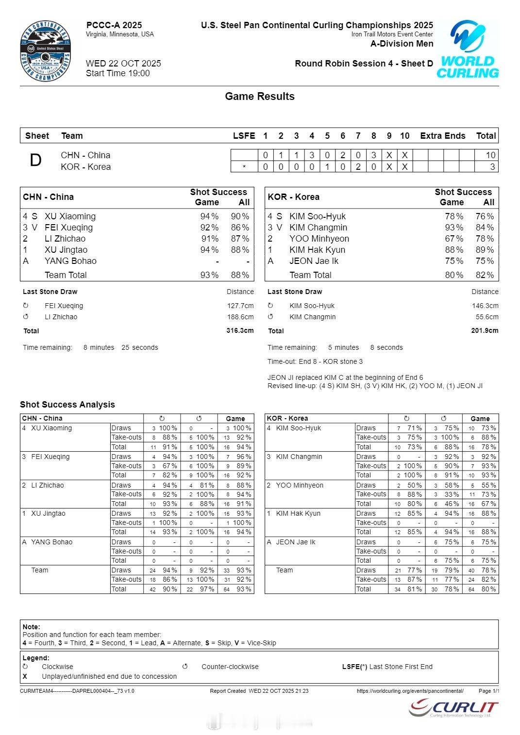 【泛洲际冰壶赛中国男队10-3大胜韩国取得三连胜】国际体坛战报速递10月22