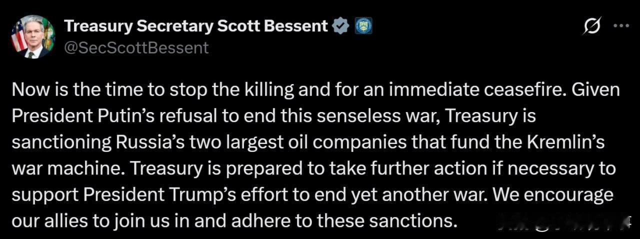 🇺🇸🇺🇦🇷🇺🛢 — 美国财政部长斯科特·贝森特: “现在是停止杀戮、立即停火的时候了。鉴于普京总统拒绝结束这场毫无意义的战争,财政部将对资助克里姆林宫战争机器的俄罗斯两大石油公司(俄罗斯石油公司和卢克石油公司)的实施制裁。 财政部准备在必要时采取进一步行动,以支持特朗普总统结束又一场战争的努力。 我们鼓励我们的盟友加入我们并遵守这些制裁。” 美国战争部长 美方财长 美国财务部长