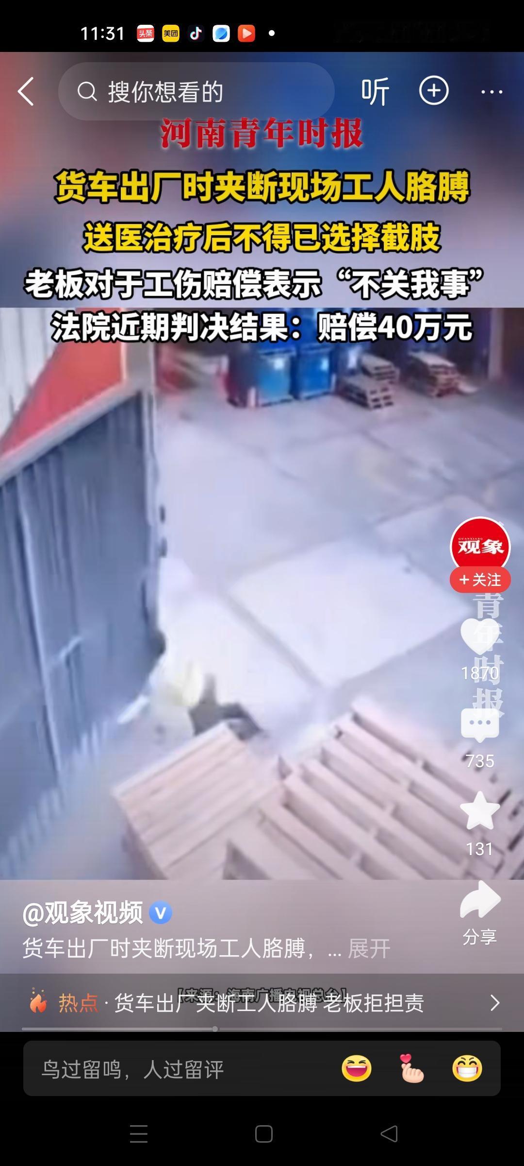 货车出厂夹断工人胳膊,送医后截肢。 老板不想承担责任,结果被法院判赔偿40万元。 工厂出了安全事故,老板肯定脱不了干系。但是这个货车也有责任,出厂速度太快,应该慢行,观察后方情况。 这个工人自己也有责任,车来了,应该把门开到最大,那么着急去关门,才造成事故。 各行各业都要遵守操作规范,安全第一啊!