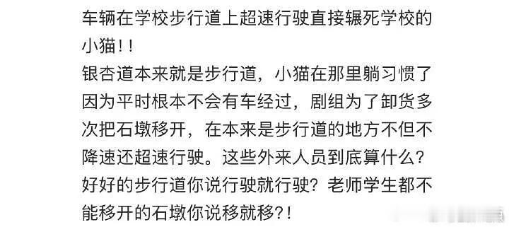 注:是在校园不允许开车的步行道上开快车,本来都有石墩子堵住的,剧组擅自移开石墩子……最后处理方式是归咎为司机疏忽,把司机开除了事