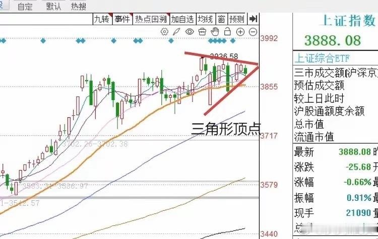 第一,首先明确观点这个位置,莎莎认为还得再观望一下,也就是说目前不能进场抄底。为什么这么说?大家请看图二上证指数日线图,从上证指数日线图,我们可以发现上证指数当前处于非常关键的三角形的顶点位置。这样的顶点位置,向上向下变盘都可以。但是目前来看,向下变盘的可能性正在增加。而一旦向下变盘的话,那么就是三角形的破位。一旦出现破位动作,短线可能有进一步的下行。最近的支撑点,我们可能要看到3800点的整数关口。那么你目前的点位还有比较明显的下行空间。