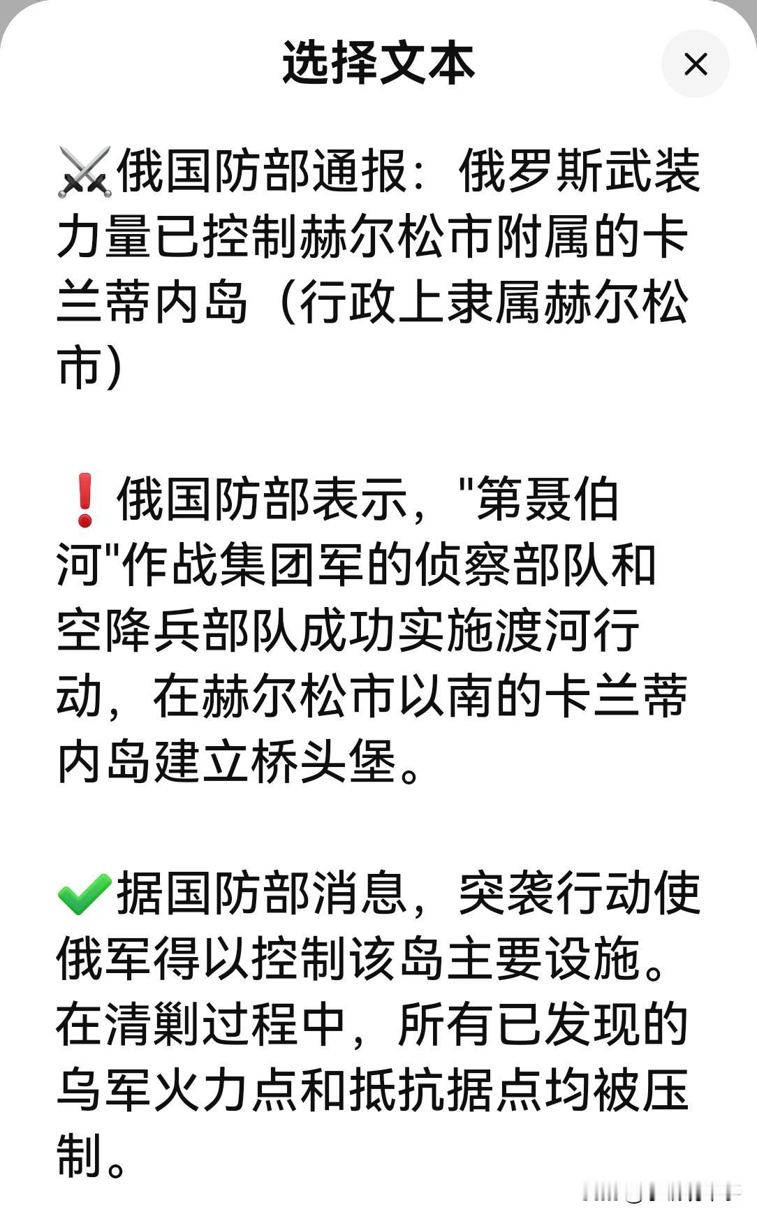 ⚔️俄罗斯国防部报告称,俄罗斯“第聂伯”集团军和空降部队通过实施渡河行动占领了位