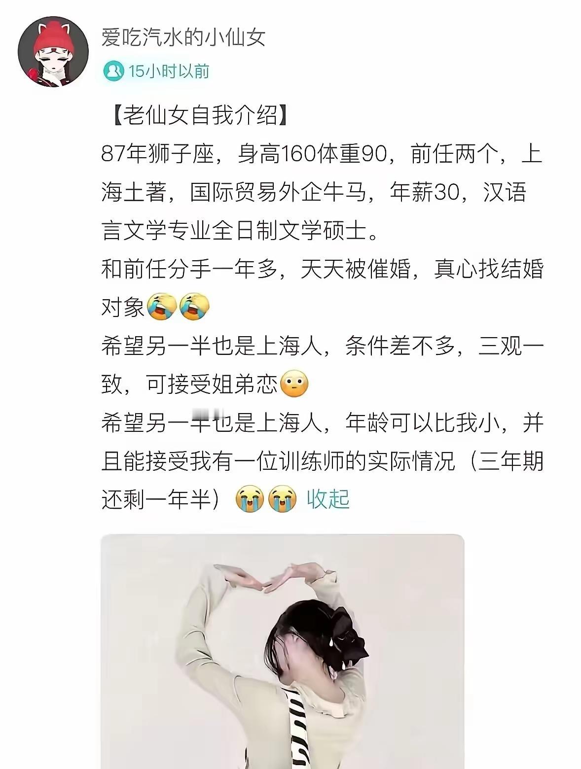 请教下,38岁的上海女的征婚广告中有一句:“并且能接受我有一位训练师的实际情况(三年前还剩一年半)”,这个训练师是指哪方面训练师?训练她什么的? 实在跟不上时代的节奏了!我盲猜下,是不是指她现在有一位情感或婚姻的训练师?他们日常就像对情侣一样相处? 如果是,那这广告不是恶心人吗?谁跟你相处,还要接受你和你的训练师还有一年半的“训练”? 说白了,这个魔都女士就是要求他未来的对象,要能接受她目前有情人的实际情况?所谓的“训练师”和那种所谓的“男闺蜜”没有什么区别吧?