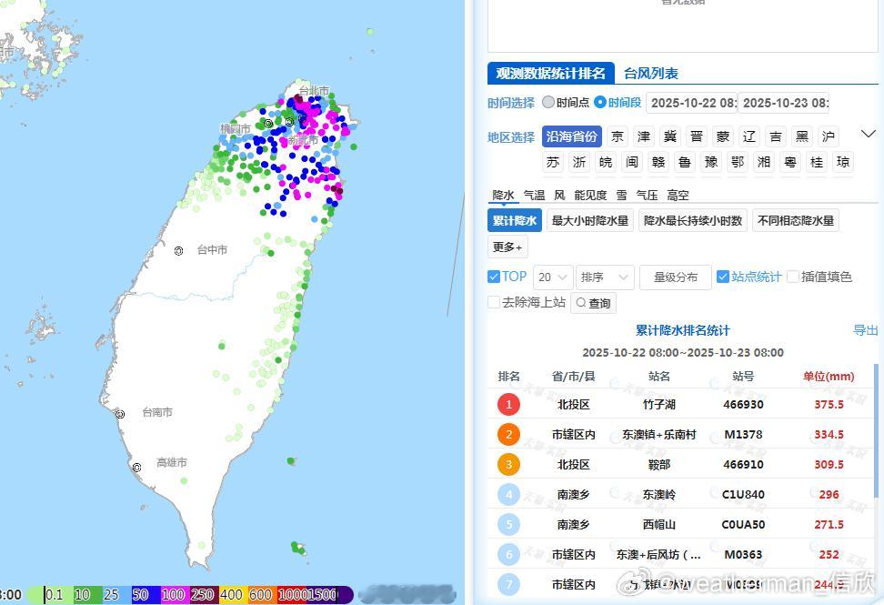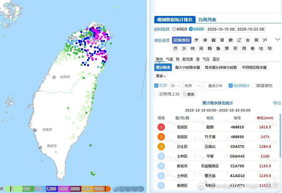 【降水】昨天到今晨,降水比较分散,青海东部、内蒙古中部等地出现降雪。海南和台湾因为台风+冷空气影响,出现强降雨。海南万宁出现大暴雨,台湾竹子湖和鞍部,连续3天出现特大暴雨。从19日08时-23日08时,96小时累计雨量看,鞍部1615.5毫米、竹子湖1474毫米,堪比很多南方城市1年降水量,是北方很多城市1年降水量的2-3倍。