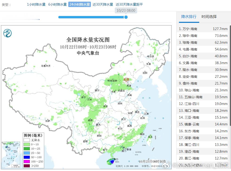 10月23日08时至24日08时,新疆沿天山地区西段,青海东部和南部、甘肃西南部、川西高原北部、西藏北部等地部分地区有小到中雪或雨夹雪,其中,西藏东北部、青海东南部、甘肃西南部、川西高原北部等地部分地区有大雪或暴雪(10~15毫米);西北地区东南部、四川盆地大部、云南西部、海南岛、台湾岛等地部分地区有小到中雨,其中,海南岛东南部、台湾岛东北部等地部分地区有大雨或暴雨(50~85毫米)。