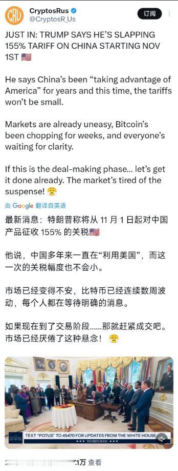 最新消息:特朗普再次称将从11月1日起对中国产品征收155%的关税。特朗普表示:“对中国商品征收更高的关税对他们来说是不可持续的。”特朗普还指出,中国多年来一直在“利用美国”,而这一次的关税幅度也不会小。 咱先说说这事儿的来龙去脉,特朗普这操作真是看腻了,当地时间 10 月 20 号他见澳大利亚总理的时候,对着记者就喊要加税到 155%,还定了 11 月 1 号这个日子,说不达成协议就执行。 可搞笑的是,他前几天刚在采访里承认,高额关税 “不可持续”,这前后打脸的速度比翻书还快。 其实这 155% 的关税根本不是直接加的,是在现有基础上叠出来的,现在美国对中国商品平均关税大概 30%,到期要涨到 54%,再叠 100% 才凑出这个吓人的数,说白了就是故意把数字往高了报,想先声夺人逼咱们让步。 他还扯什么 “中国多年来利用美国”,这纯粹是睁眼说瞎话,这些年明明是美国一直在贸易上搞小动作,又是限制芯片出口,又是搞投资审查,咱们才针对性地收紧稀土管制,这都是维护自己利益的正当做法,怎么就成 “利用” 了? 他心里门儿清自己要啥,张口闭口就是稀土、大豆、芬太尼这三样,稀土是美国高科技产业离不开的,大豆是他们农业州的命脉,芬太尼是美国自己的社会问题,解决不了就往咱们身上甩锅,合着就许他们提要求,咱们维护权益就不行? 更有意思的是,这已经不是他第一次玩这套了,今年 4 月份他就威胁要征 145% 的关税,结果呢?没过多久就宣布撤销一大半,还延长了休战期。 当时美股因为他的威胁直接暴跌,市值蒸发两万亿美元,美国财长都急了,公开说高关税撑不下去,想让咱们松口稀土管制换关税豁免。 这次 155% 的威胁比上次更夸张,但可信度更低,他自己都知道这税真落地了,首先扛不住的是美国自己。 咱得掰扯清楚,这关税到底是谁在买单,特朗普嘴硬说 “中国支付关税”,纯属骗人的鬼话,稍微动脑子想都知道,中国商家不可能自己把利润贴进去交关税,最后还不是美国进口商涨价,把成本转嫁给美国老百姓? 耶鲁大学都算过账,就现在的关税水平,美国普通家庭一年就得多花 2800 美元,要是真加到 155%,那物价不得飞上天?到时候美国消费者买个中国产的日用品都得翻倍花钱,企业进货成本暴涨,搞不好又得裁员倒闭,这亏美国自己都吃不起,特朗普心里比谁都清楚,所以这税真落地的可能性几乎没有。 再说了,咱们中国现在早就不是十几年前了,哪还会被这点威胁吓住?这些年咱们早就开始布局了,稀土管制只是其中一招,关键技术领域咱们自己在突破,国内市场越做越大,就算对美贸易少点,还有其他国家的市场顶着。 美国大豆咱们早就找了别的供应国,稀土更是咱们的优势资源,他们想卡咱们脖子没门,反而他们自己离了这些资源寸步难行。特朗普拿关税当筹码,根本就是找错了方向,这牌早就不好使了。 还有个细节特能说明问题,他一边喊着加税,一边又说 “相信中国会坐下来谈判”,还透露要在 APEC 峰会和咱们见面,甚至说 2026 年初要访华。 这就露怯了,要是真有底气硬刚,犯得着又打又拉吗?说白了,他这都是演给美国国内选民看的,中期选举不远了,他得装出 “对华强硬” 的样子拉选票,但又怕真把贸易搞崩了,影响美国经济,最后没法给选民交代,所以才搞出这么个又凶又软的戏码。 咱们外交部的态度一直特明确,早就说了,关税战没有赢家,打咱们奉陪到底,谈大门敞开,但必须平等尊重,不能拿威胁当筹码。 这话说得太对了,想让咱们让步可以,得拿出诚意,别搞这套虚头巴脑的施压。特朗普要是还抱着 “要么签协议要么加税” 的霸道心态来谈,那肯定谈不出结果,他之前多少次威胁最后都不了了之,这次也一样,真以为咱们会吃他这一套? 说穿了,特朗普这 155% 的关税威胁就是纸老虎,看着吓人,一戳就破。他自己都承认不可持续,美国经济也扛不住,本质就是政治表演。 咱们根本不用慌,该谈就谈,该维护利益就维护,他爱喊就让他喊去,最后还得回到平等谈判的桌上。