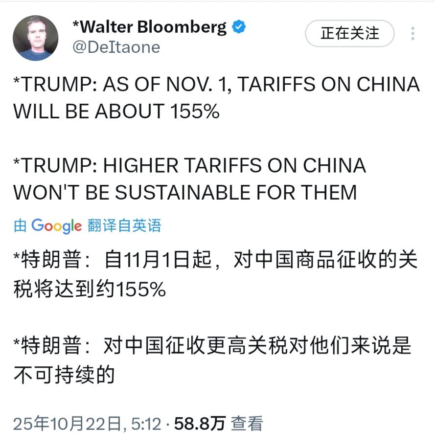 最新消息:特朗普再次称将从11月1日起对中国产品征收155%的关税。特朗普表示: