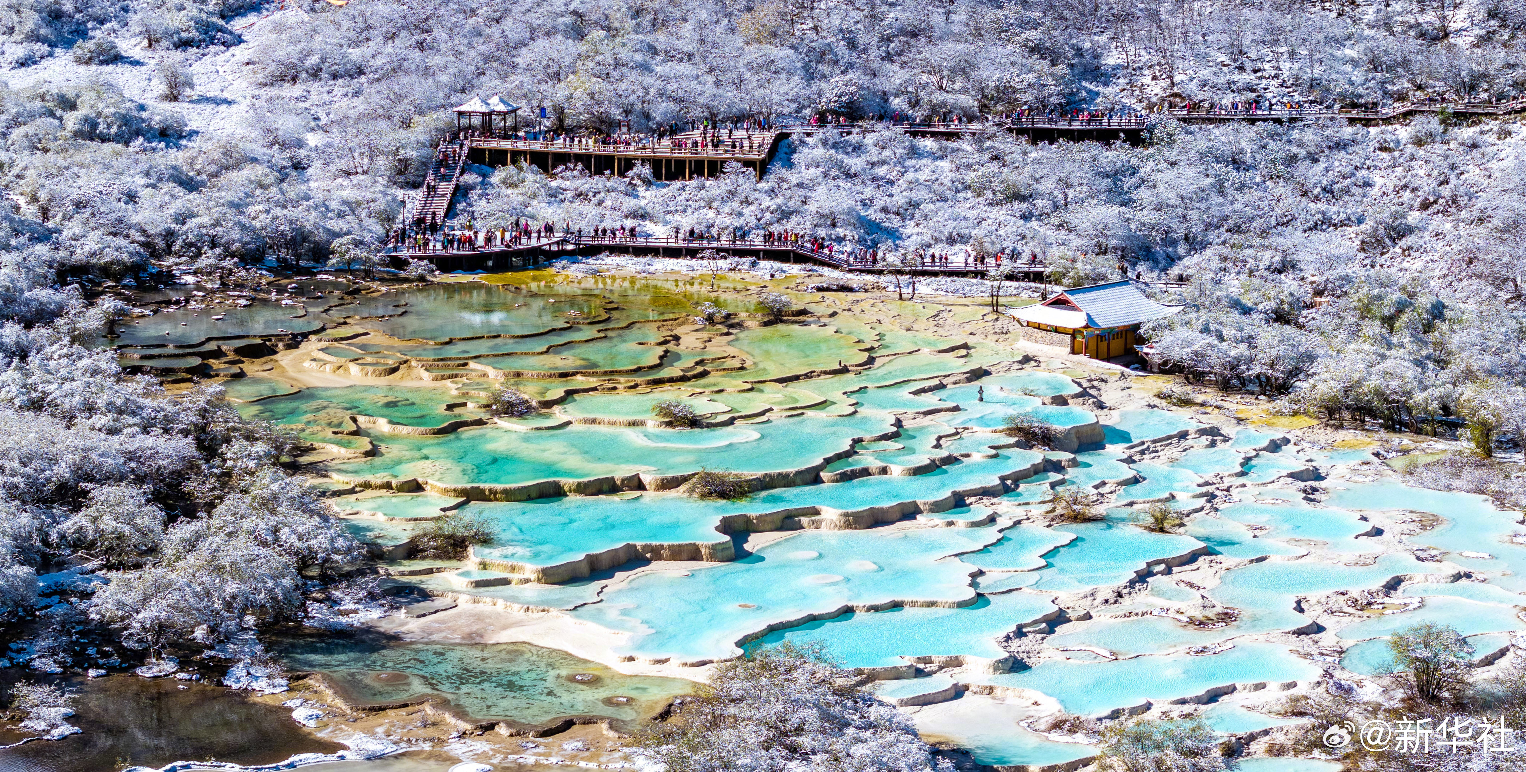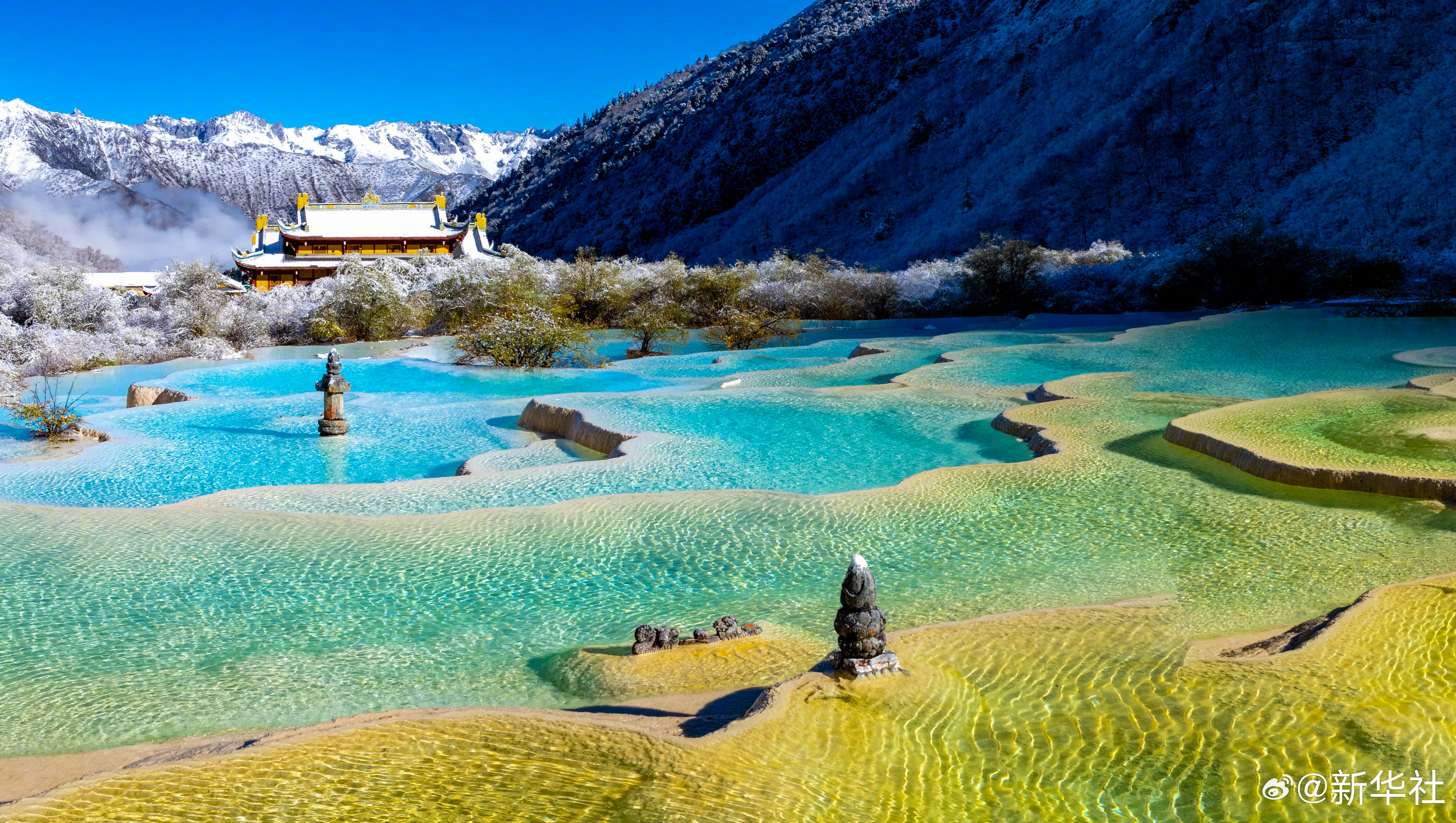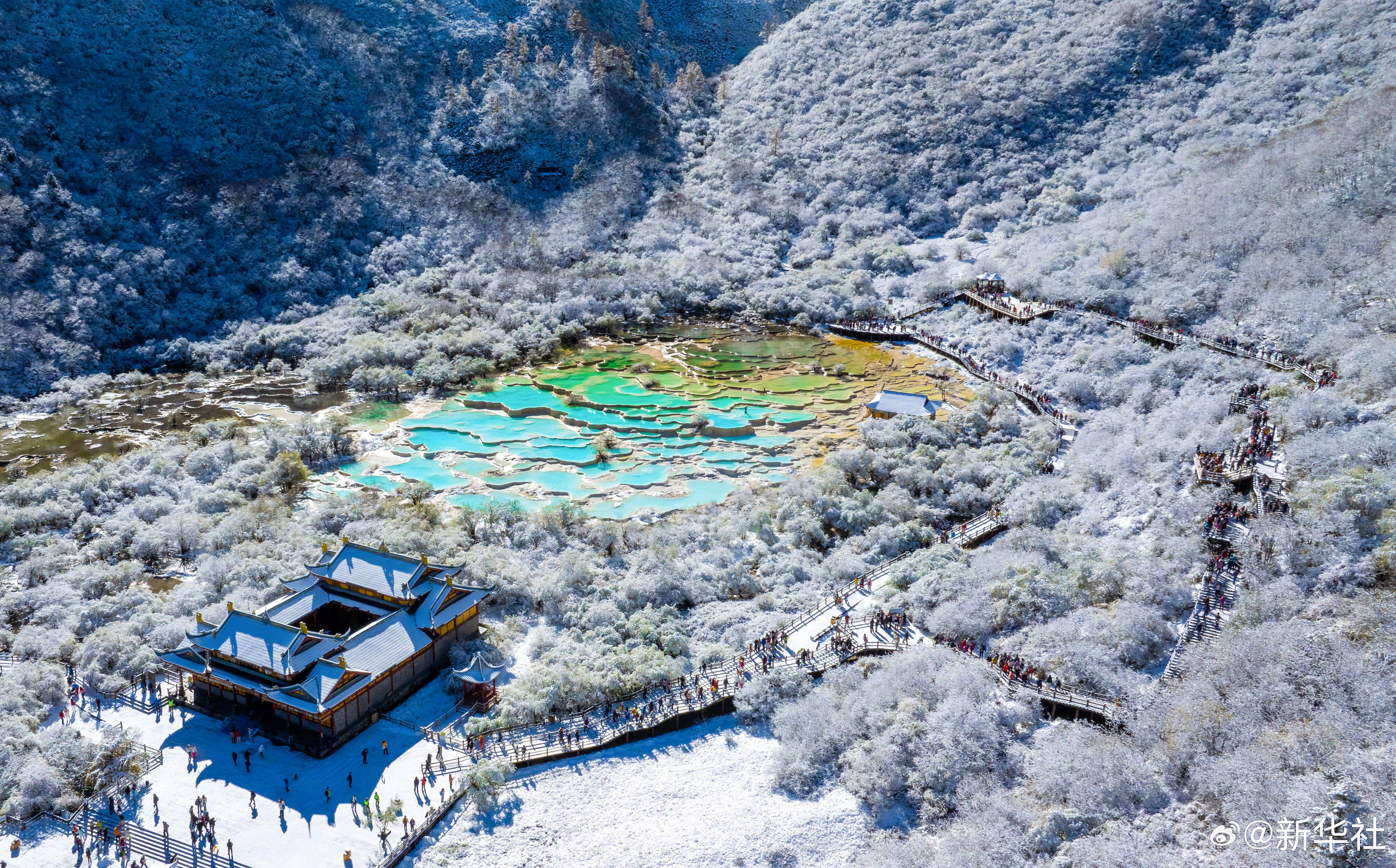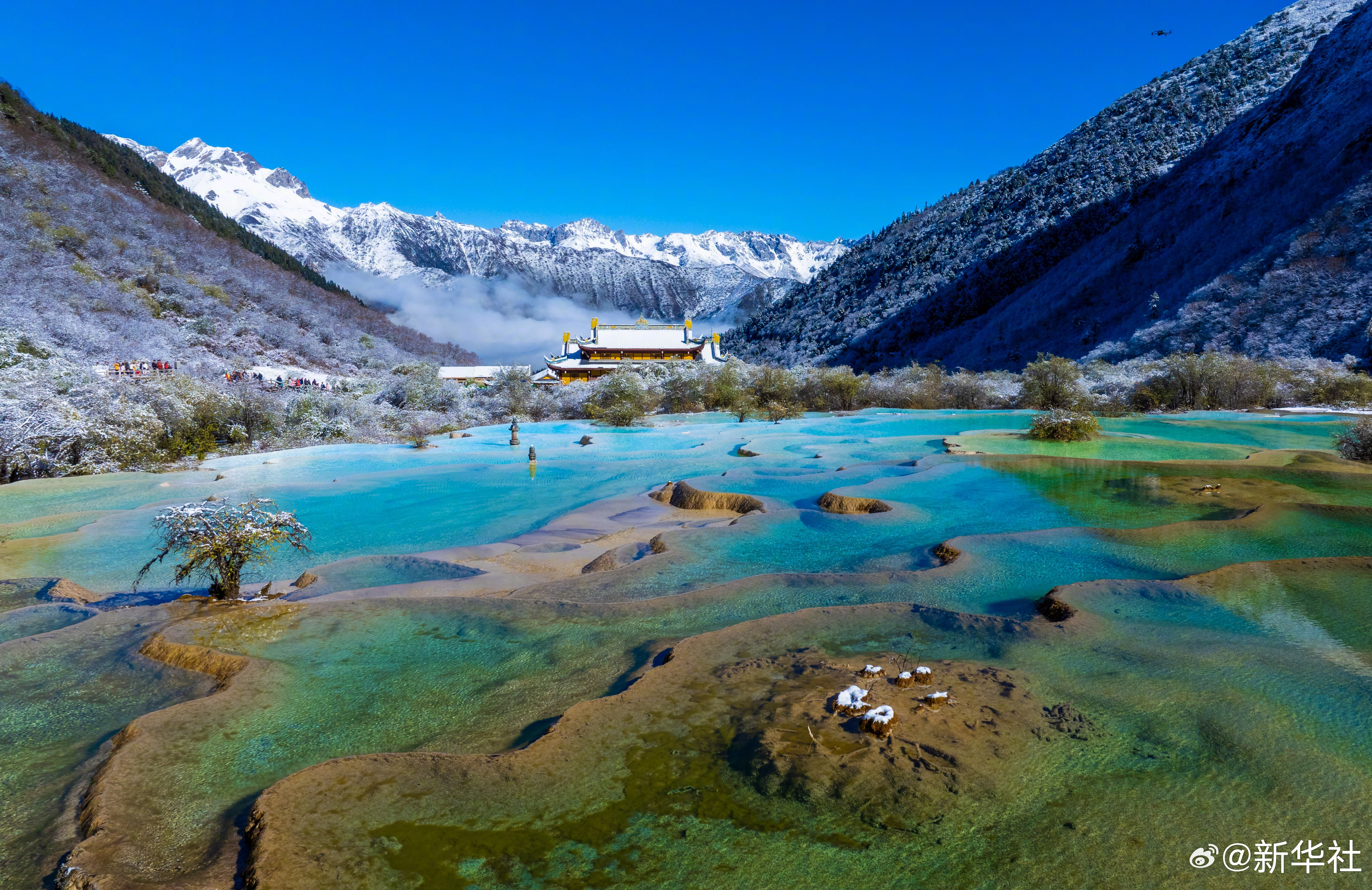 #新华社出图#【#镜头下的黄龙初雪盛景#】#黄龙初雪与五彩池浪漫撞色# 近日,四川黄龙景区迎来今秋第一场降雪,五彩池与皑皑白雪交相辉映,美不胜收。今日迎来霜降,评论区晒出你所在地的深秋美图吧↓↓(摄影:孙家鹏)
