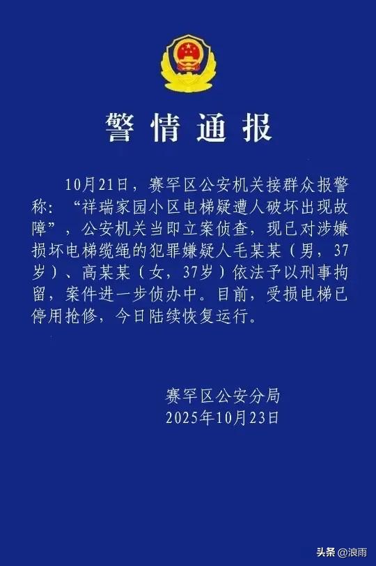 值得注意的是,电梯钢丝绳遭人为切割的祥瑞家园小区,在今年2月份的时候因为原物业不知道什么原因宣布撤场。4月份的时候物管会又公开招聘了物业,虽然过程一波三折。但总算是又有了物业,那想到这个新物业在6月份的时候就被公开通报了,原因包括物业服务人员少,环境脏乱差,垃圾清理不及时,公共设施设备维护不到位,捆绑收费,侵害业主公共收益等方面。 而这次破坏小区电梯钢丝绳的男子毛某某和女子高某某无论是什么身份,什么原因,他们都万万不能用破坏保障电梯运行安全的钢丝绳的方式去发泄。此举严重危害了大家的生命安全,简直就是“谋杀”。这两个人不是蠢就是坏。 等待他们的必将是严厉的惩罚。