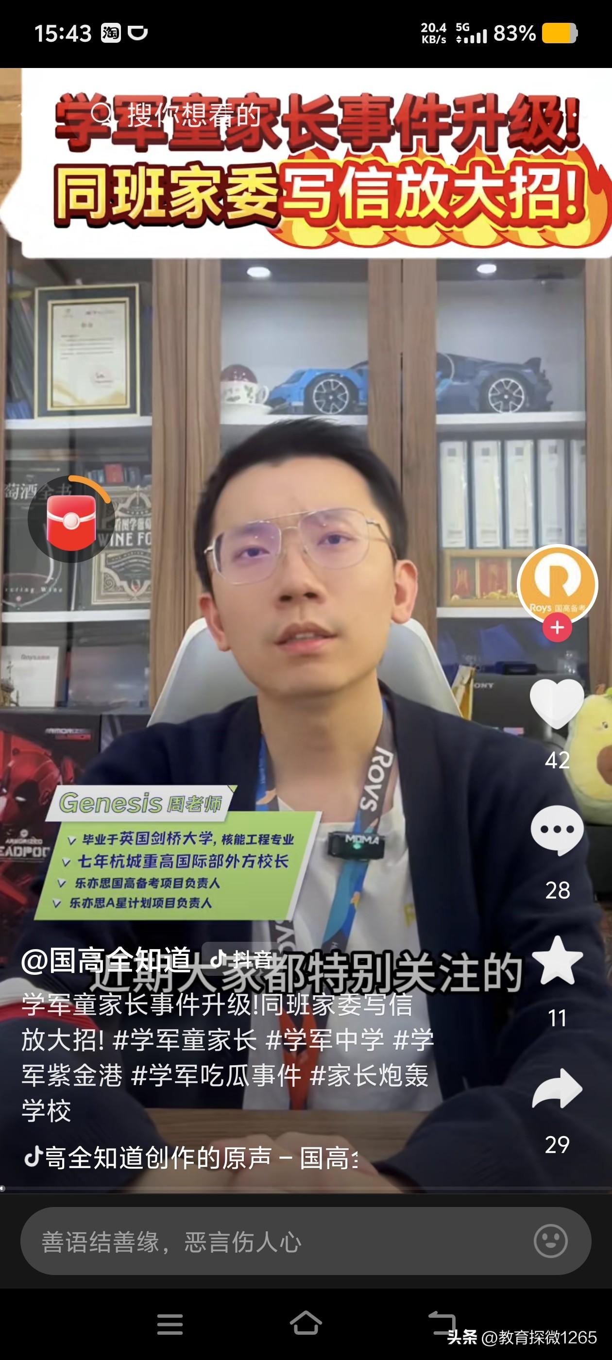 童浩阳刚到学军紫金港高中高一,家长跟学校闹起来,一是孩子选班长没选上,家长觉得选班干部的方式不合理;二是家长提了俩建议“搞军训视频活动、家委会怎么开会”,班主任没听,再加上家长误会了“最慧学”平台要收费,矛盾就爆发了。 之后家长没跟其他家委会成员商量,就借着家委会的名义搞调查,要求换班主任。 跟学校谈了好几次都没谈拢,家长干脆上网发帖说这事,引了不少人关注。 现在学校说,大部分家长和学生都支持班主任,这位班主任每天从早忙到晚,对学生也上心,学生还曾主动给他鼓掌。但这事已经影响到班主任和班里的正常教学了,两边还得接着沟通。 家长管得太宽,把家长配合学校变成了家长要指挥学校。 选班干部的程序本来没问题,就因为自己孩子没选上、建议没被听,就非要换班主任,还乱用车委会的名义、上网造势,根本不是为孩子好,就是自己闹情绪。 家委会本来是帮着家长和学校沟通的,结果被用来干这种逼学校的事,完全变味了。 再说班主任,明明尽心尽力,就因为个别家长不满意,就得受舆论折腾,这事传出去,以后哪个老师还敢放开手管学生? 更不该的是,家长把网络当武器,断章取义说事儿,毁老师名声。 学校虽然说支持班主任,但之前没管好家委会,后来还退了平台费,等于变相惯着这种一闹就妥协的行为,也不对。 教育不是“家长想怎样就怎样”,家长得守好自己的本分,别瞎干预学校的管理;学校也得把规则说清楚,别和稀泥。不然最后坑的,还是班里所有孩子。