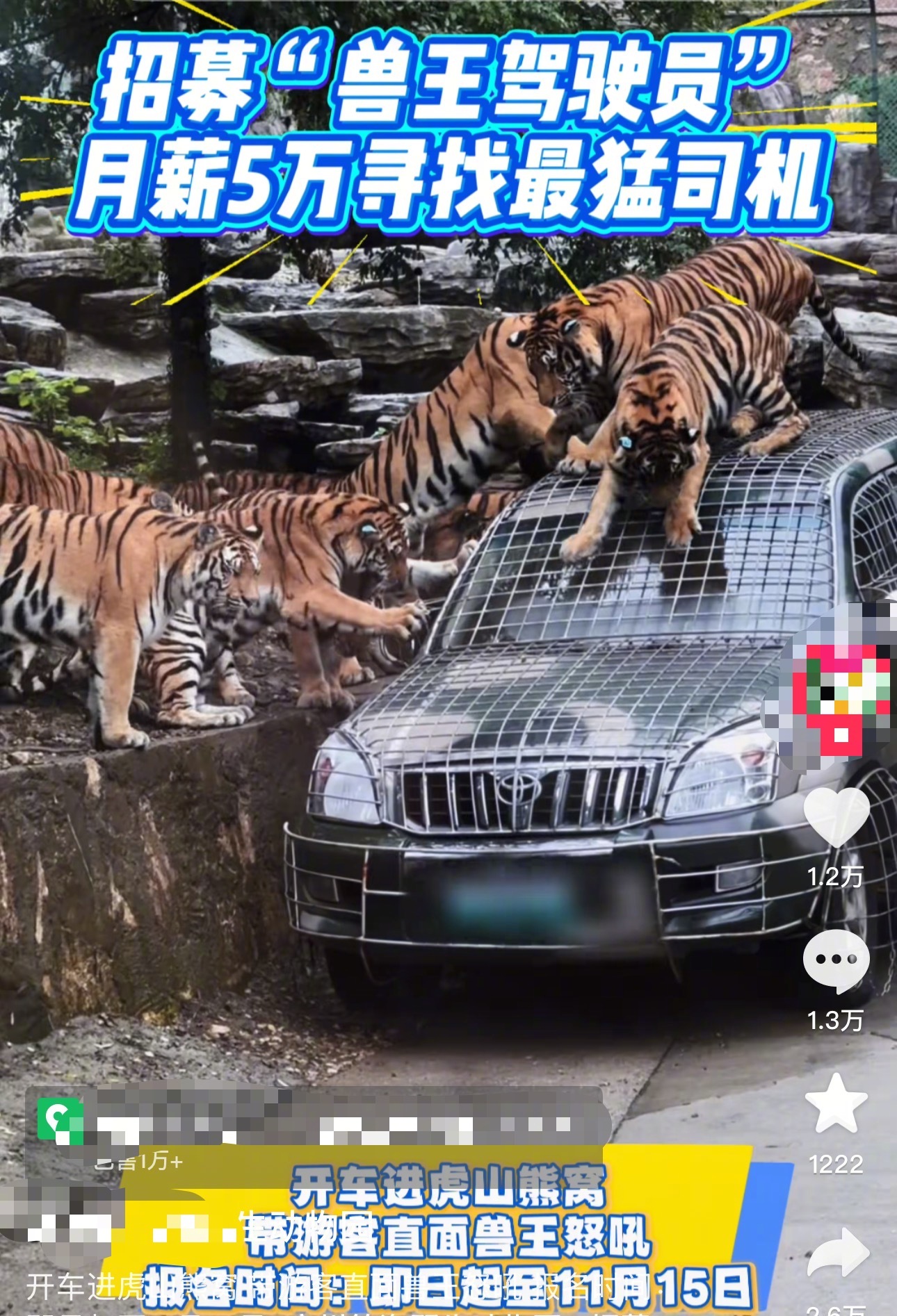 大皖新闻记者注意到,10月22日晚,该动物园在社交平台发布了一则招聘视频,称以“月薪5万”招募“兽王驾驶员”,负责驾驶车辆进入虎山、熊窝等猛兽散放区,“带游客直面兽王怒吼”。
