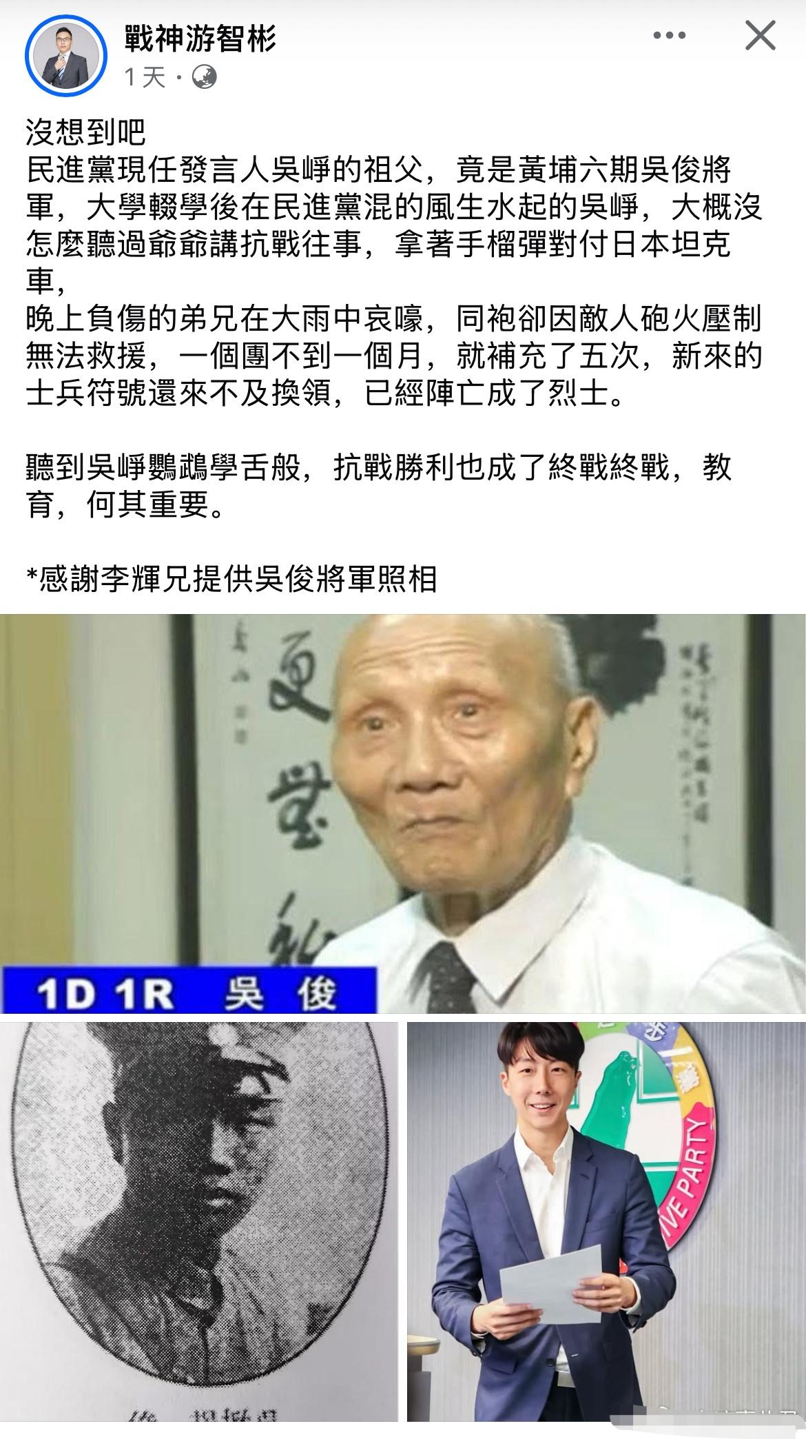 民进党发言人吴峥爷爷是黄埔六期的吴俊将军,真的是辱没祖宗了 !