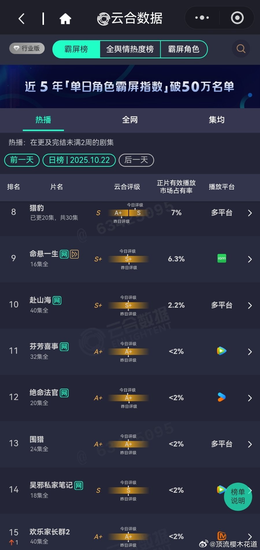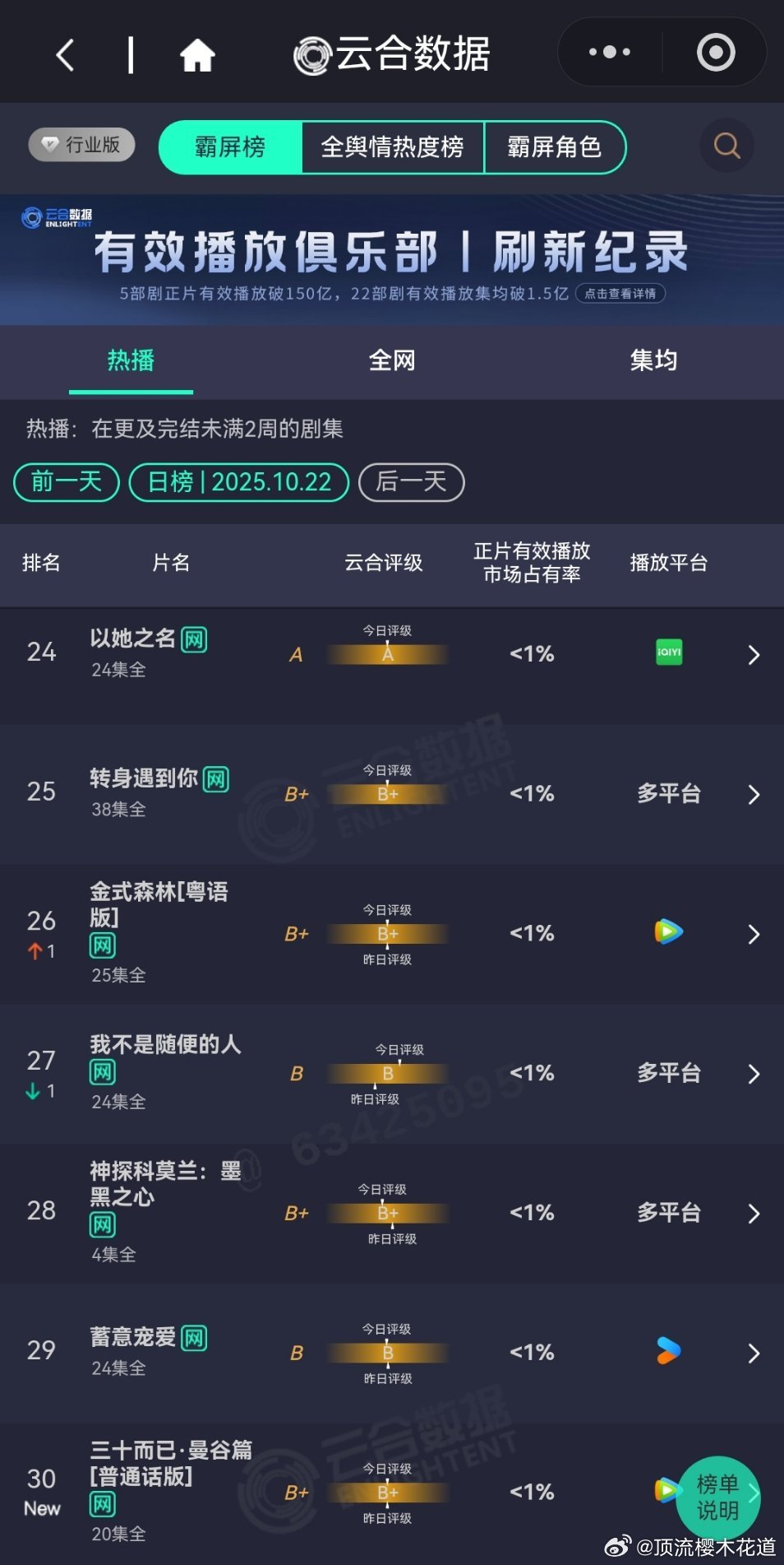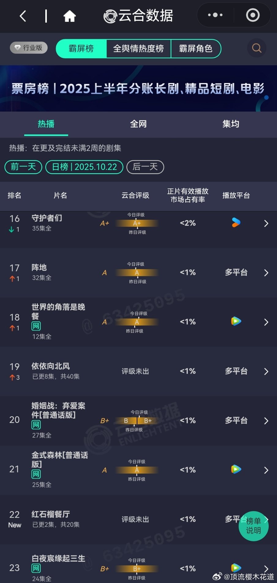 10月22日云合播放占比云合