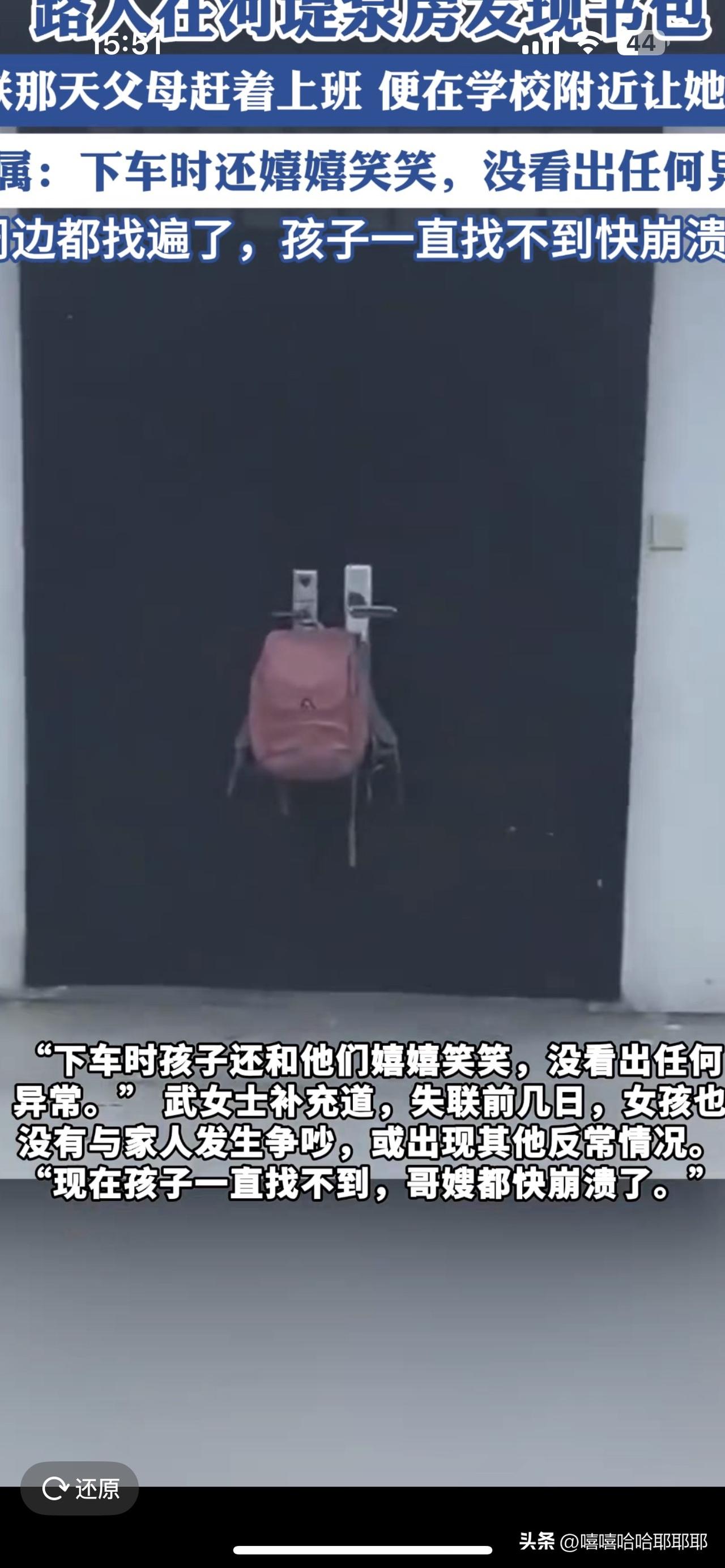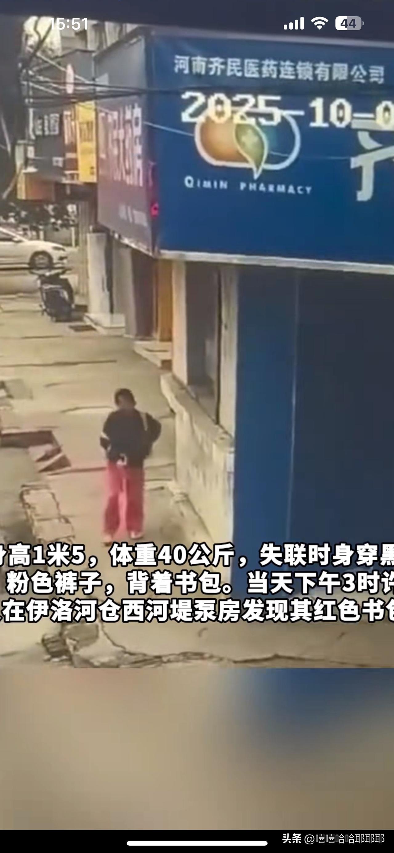 揪心十四女孩在上学路上失踪,已经整整丢失十四天了, 事发河南巩义,过完国庆节开学的十月九日早上六点四十分女孩像往常一样父母送到学校上学,然而学校附近下车的时候还有说有笑,可是谁也没想到这短短的几分钟女孩像人间蒸发一样,失去了音讯,父母整天以泪洗面,每分每秒都在受煎熬,是怎么的撕心裂肺? 女孩的父母穿过大街走过小巷该找的地方都反复寻找都没有突破性的进展,监控关键时候就是盲区,目前能追踪到的就是他独自前行的画面,行动轨迹断了线,一个活泼可爱的孩子为什么突然消失了呢,是临时起意还是遇到了外界因素. 让人感到不解的是他的书包还挂在了一个河边的泵房,像个谜一样让人担惊受怕,天气越来越冷,看完家里人的讲述,更让人感到担忧! 目前为止女孩已经失踪十四天了,社会真的不安全了,很多孩子只要丢失就是水里,江边桥边,或者在山里,希望这个女孩是幸运的,能够奇迹般瞬间出现在父母身边,祈祷平安归来[祈祷][祈祷][祈祷]