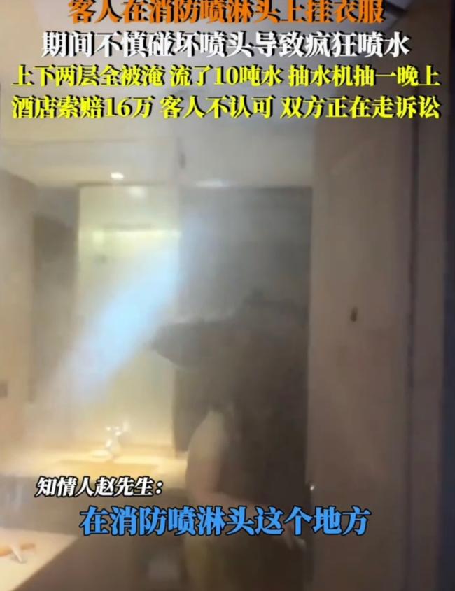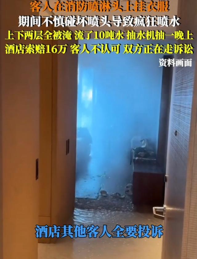 晾个衣服的代价太大了!10月12日报道,国庆期间,一位客人在消防喷头上晾衣服,不料闯下大祸,消防喷头被损坏流了10吨水,淹了宾馆上下两层楼10余间房,被宾馆索赔16万元。客人认为金额太大不认可,双方协商不成,只得通过法律途径提起诉讼解决此事。网友:说实话16万赔偿真心不多,赶紧赔吧,不然赔得还更多。 10月12日中安在线报道,国庆假期,浙江一位游客入住一家酒店后,在酒店房间里晾衣服,找了一圈没找到合适挂衣的地方,于是这位客人把湿衣挂在了天花板上的消防喷淋头上。 谁知道就这么一挂,喷淋头的红色玻璃球装置被碰坏了,水流瞬间喷涌而出,酒店工作人员发现后立即关闭了阀门,但管道里储存的水还是源源不断地流出来,足足有10吨之多。 现场的情况相当惨烈,水流从天花板倾泻而下,很快就淹没了整个房间,接着渗透到楼下,最终波及上下两层楼的10多个房间,酒店动用抽水机连续工作了一整夜,才把积水清理干净。 更糟糕的是事发时正值国庆黄金周,酒店本来客满为患,突如其来的水灾让其他住客纷纷要求退房退款,受损的房间短期内无法继续营业,酒店的损失可想而知。 经过初步核算酒店方面提出了16万元的赔偿要求,这个数字包括了房间修复费用、设备更换、停业损失等多项开支,但这位客人觉得金额太高,双方谈不拢最后只能对簿公堂。 说起来这种事并不罕见,贵阳曾有住客因为同样的原因赔了2000元,大连的一起案例赔偿金额达到1万多元,法院在处理这类纠纷时,通常会认定住客存在过错,需要承担相应的赔偿责任。 消防喷淋系统的作原理其实很简单,喷头内部有一个充满特殊液体的玻璃球,正常情况下它能承受一定压力,但当温度升高到设定值,或者受到外力撞击时,玻璃球就会破裂,触发喷水装置,这套系统设计精密反应灵敏,就是为了在火灾发生时能够第一时间启动。 游客作为成年人,理应知道消防设施不能随意触碰,更不能当作晾衣架使用。 也有网友质疑,既已经关闭了阀门,为什么还会流出10吨水,这说明酒店的应急管理可能存在改进空间,正常情况下发现喷头破损后,10分钟内就应该能够关闭相应区域的供水系统,不至于造成如此大的损失。 至于16万元的赔偿金额是否合理,需要看具体的损失清单,两层楼10多个房间的装修维护、地板更换、电路检修,再加上黄金周期间的营业损失,这个数字可能还真不算离谱,有网友甚至认为如果严格计算各项损失,最终赔偿可能远不止16万。 这起事故给所有人敲响了警钟,入住酒店时千万别把消防设施当成普通的生活用品,那些看起来像挂钩的东西,可能是烟感探测器,天花板上的喷头更是碰不得的。 对酒店来说除事后索赔,更应该在预防上下功夫,比如在房间里配备晾衣架,在消防设施附近贴上醒目的警示标识,入住时主动提醒客人注意事项,毕竟防患于未然总比事后补救要好得多。 这件事的最终结果如何,还要等法院判决,但无论赔多少钱这个教训都足够深刻了,出门在外多一份小心总没错。 麻烦看官老爷们右上角点击一下“关注”,既方便您进行讨论和分享,又能给您带来不一样的参与感,感谢您的支持!